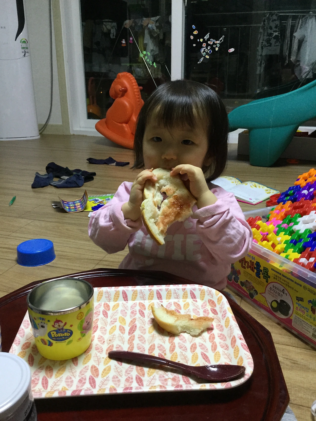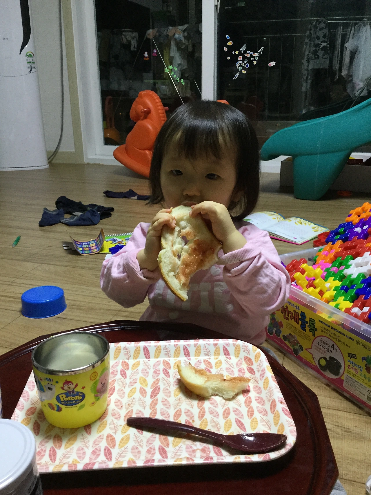모냥은 볼품없어도 참 잘먹은 우리 다온이. 언제 이렇게 커서 빵에 잼도 바르고 먹기도 하고