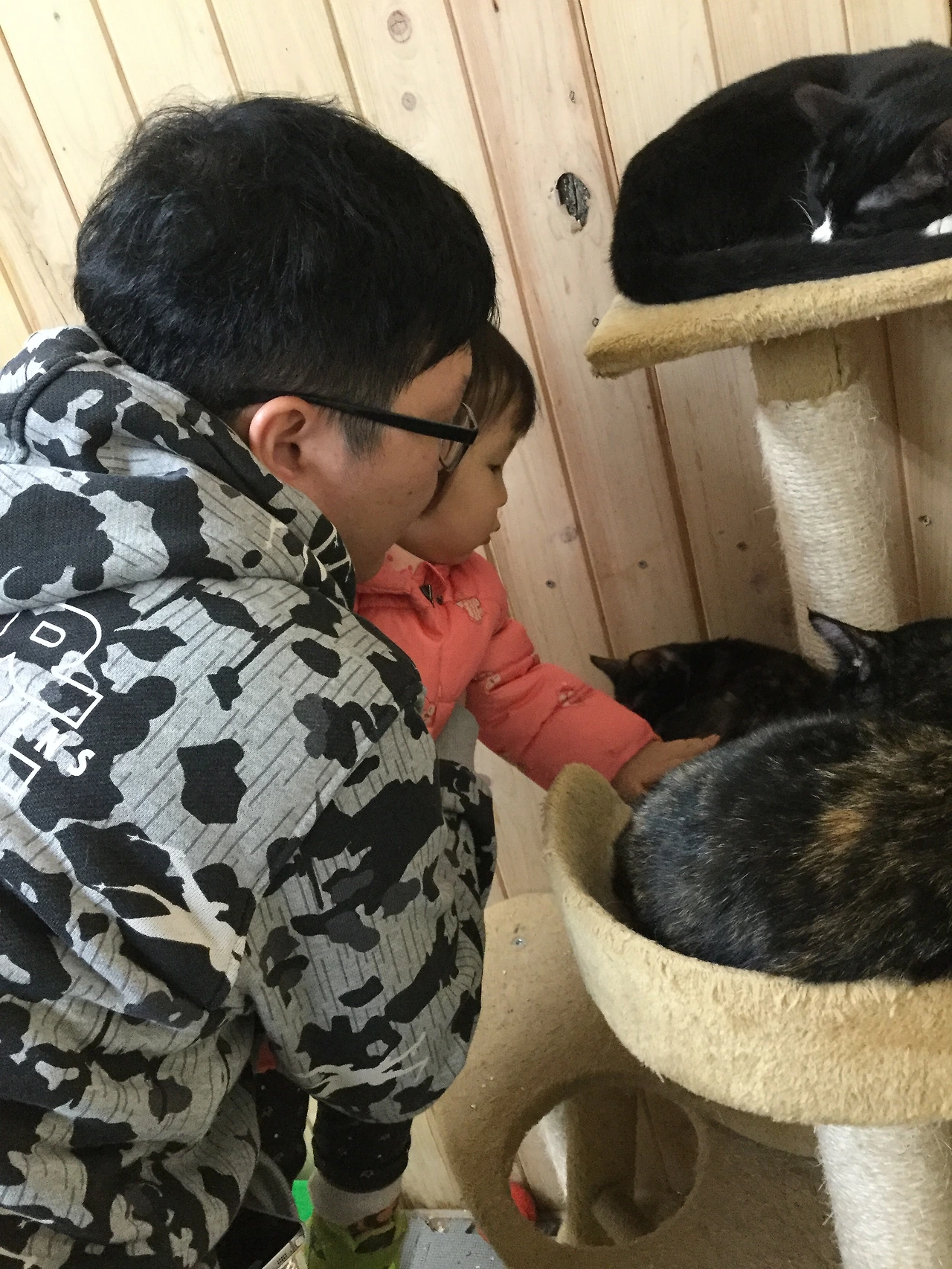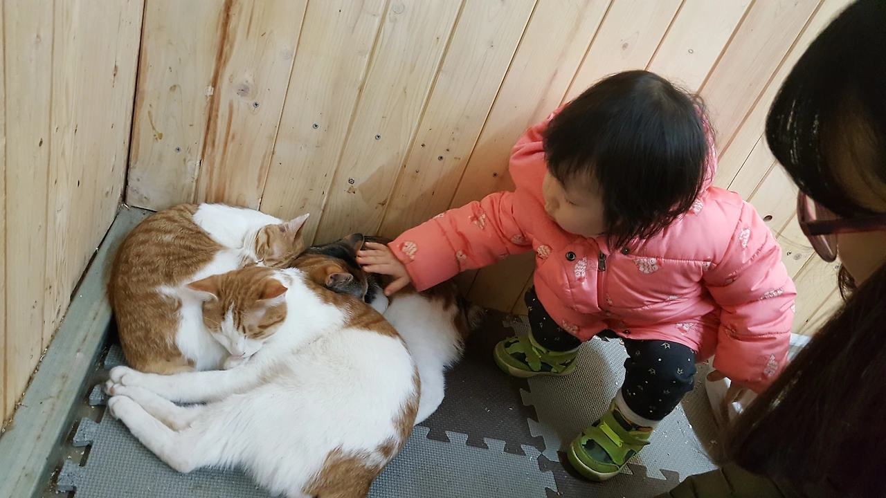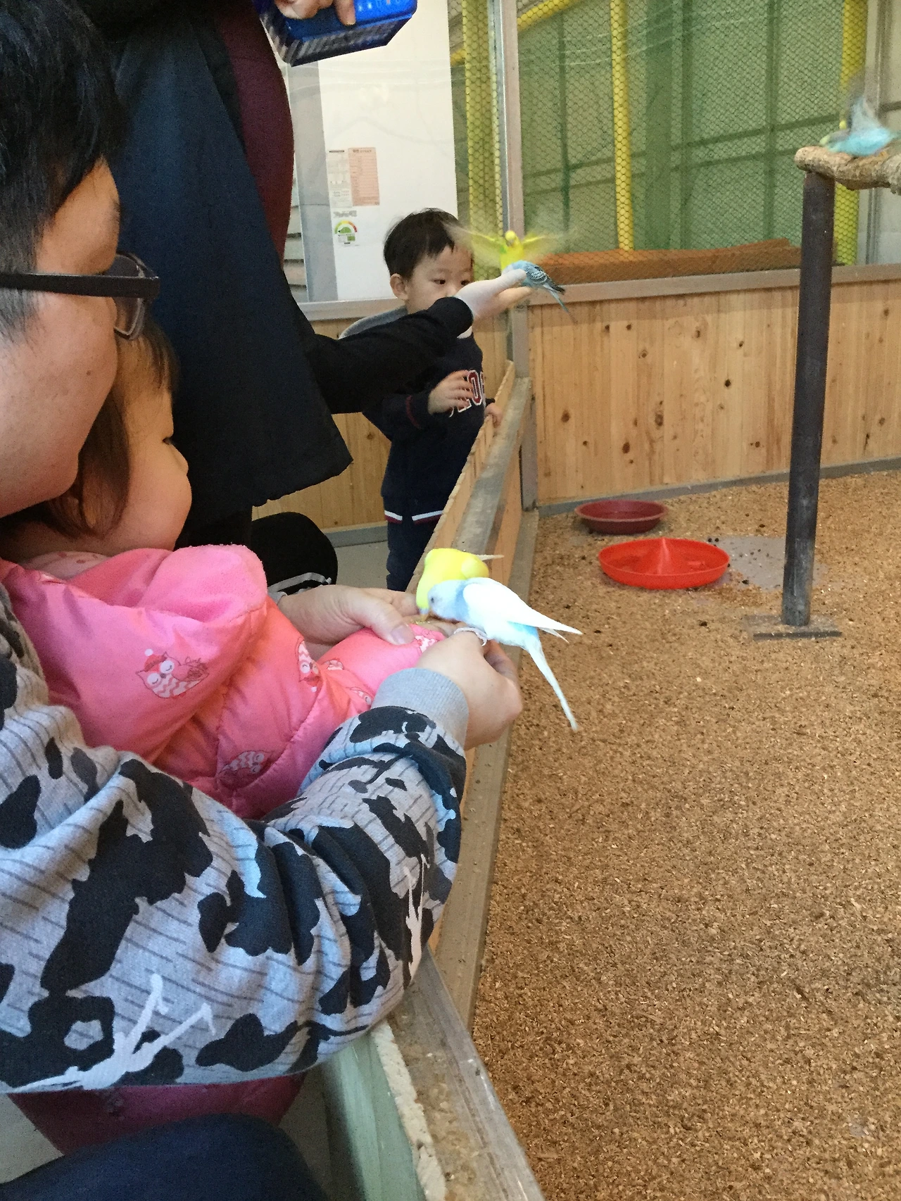 고양이 방에 가서 고양이도 만지고 잉꼬방에 들어가서 먹이도 주고.