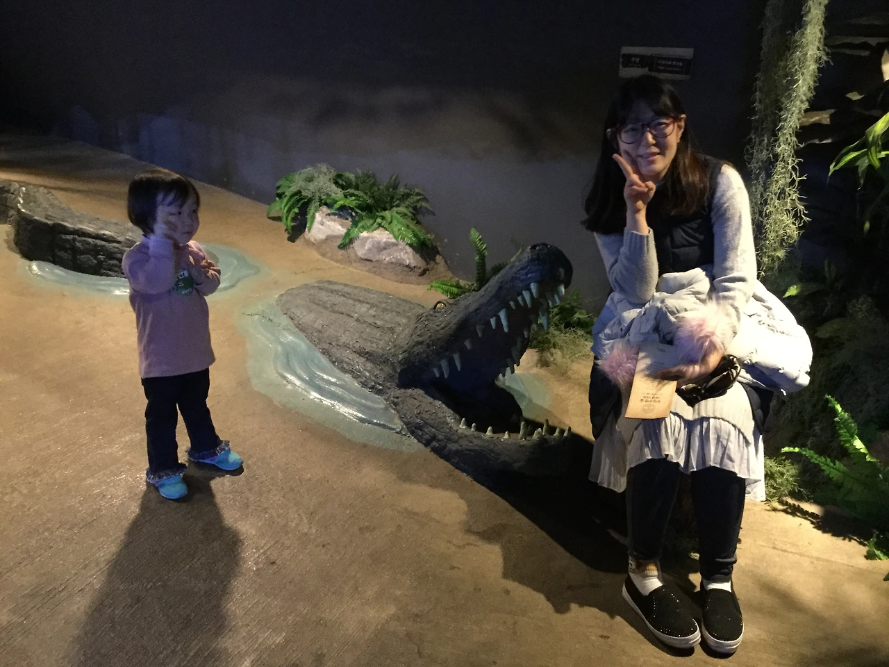 왠지 악어 옆에서 사진찍고 싶었던 다온애미, 모형옆에서 브이. 다온이는 모형인지 진짜인지 몰라