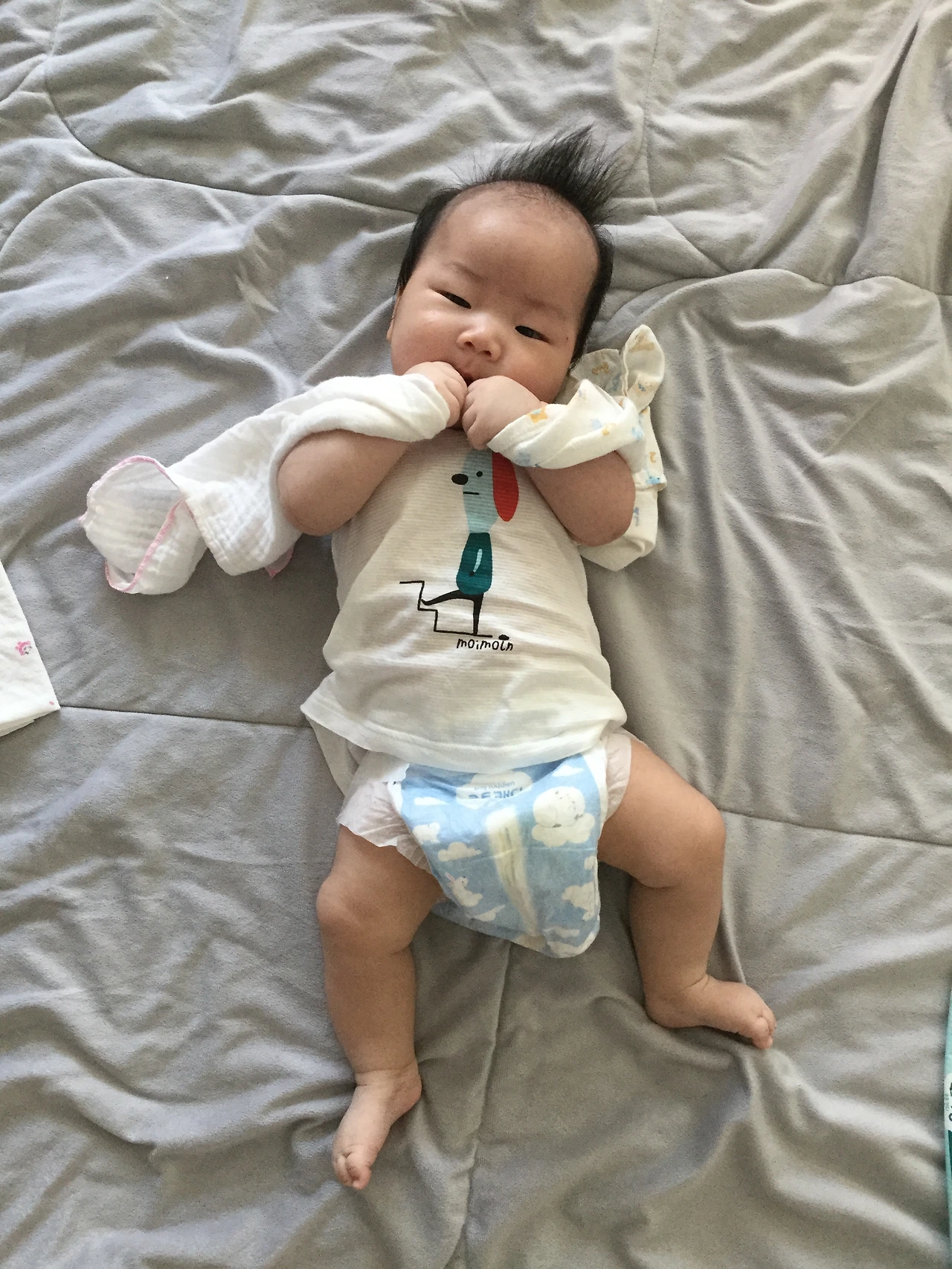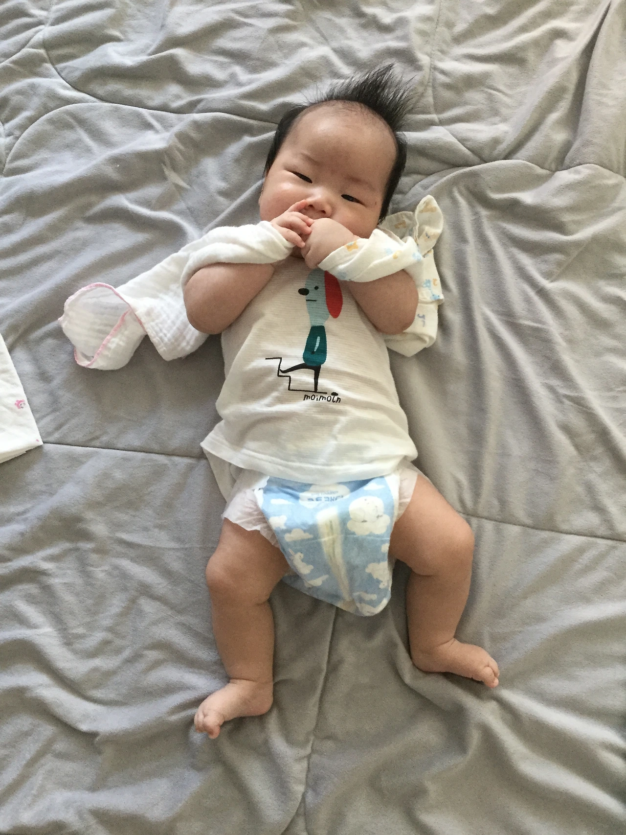 이제 꽤 쥐는 힘이 생겨서 수건을 쥐어주면 꼭 쥐고 있다.ㅋㅋㅋㅋ