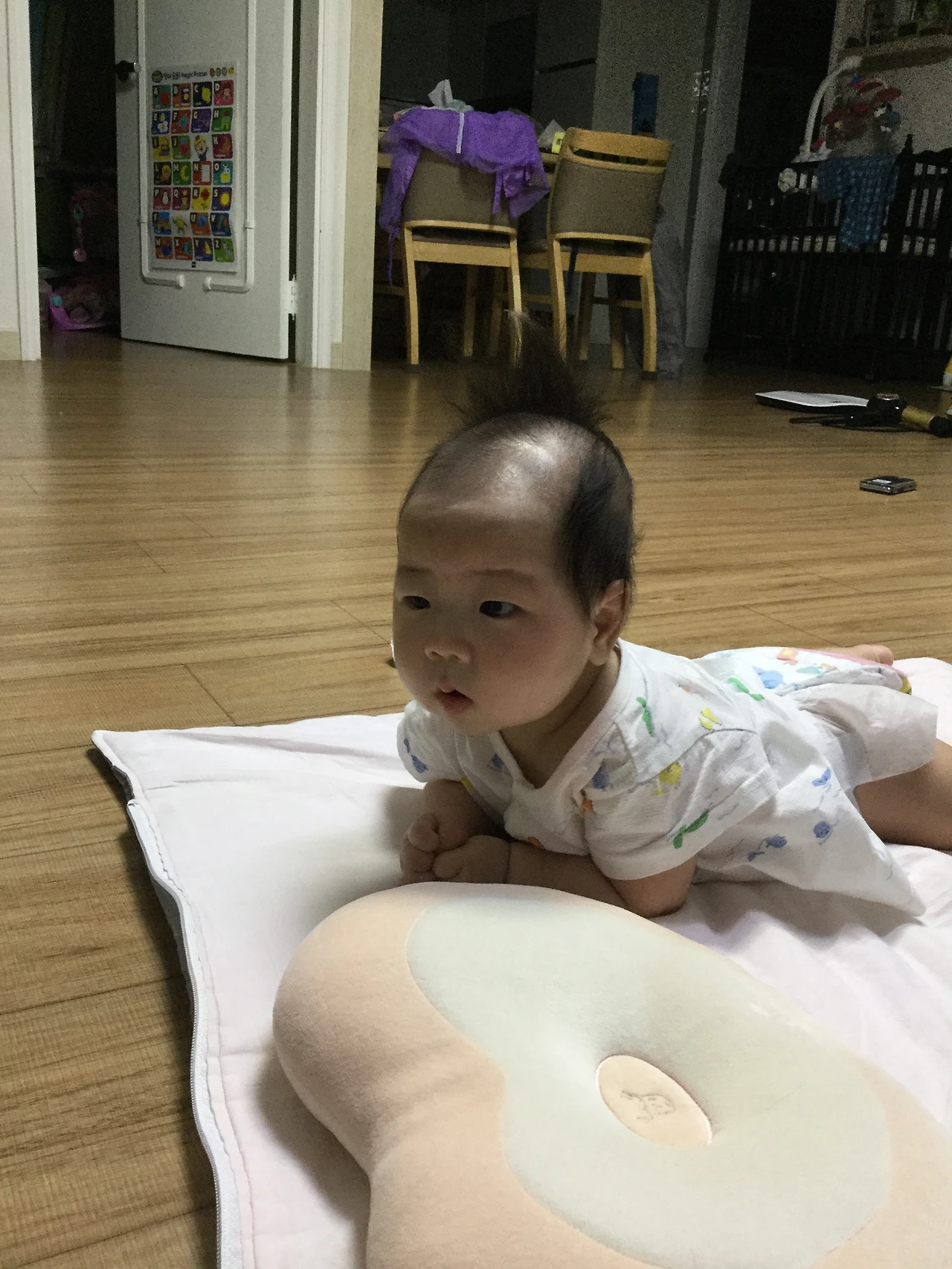 라온이는 고개를 7-80%만 가눈 상태였기 때문에 그는 뒤집어 고개를 들어 잠시 순찰을 한후