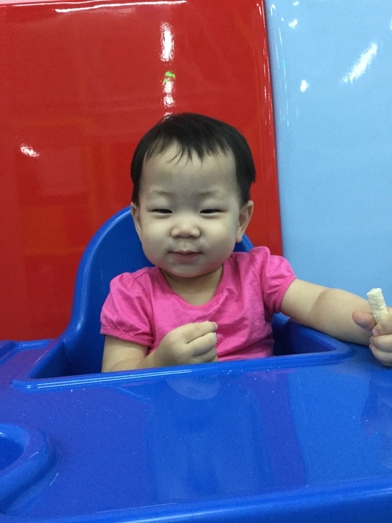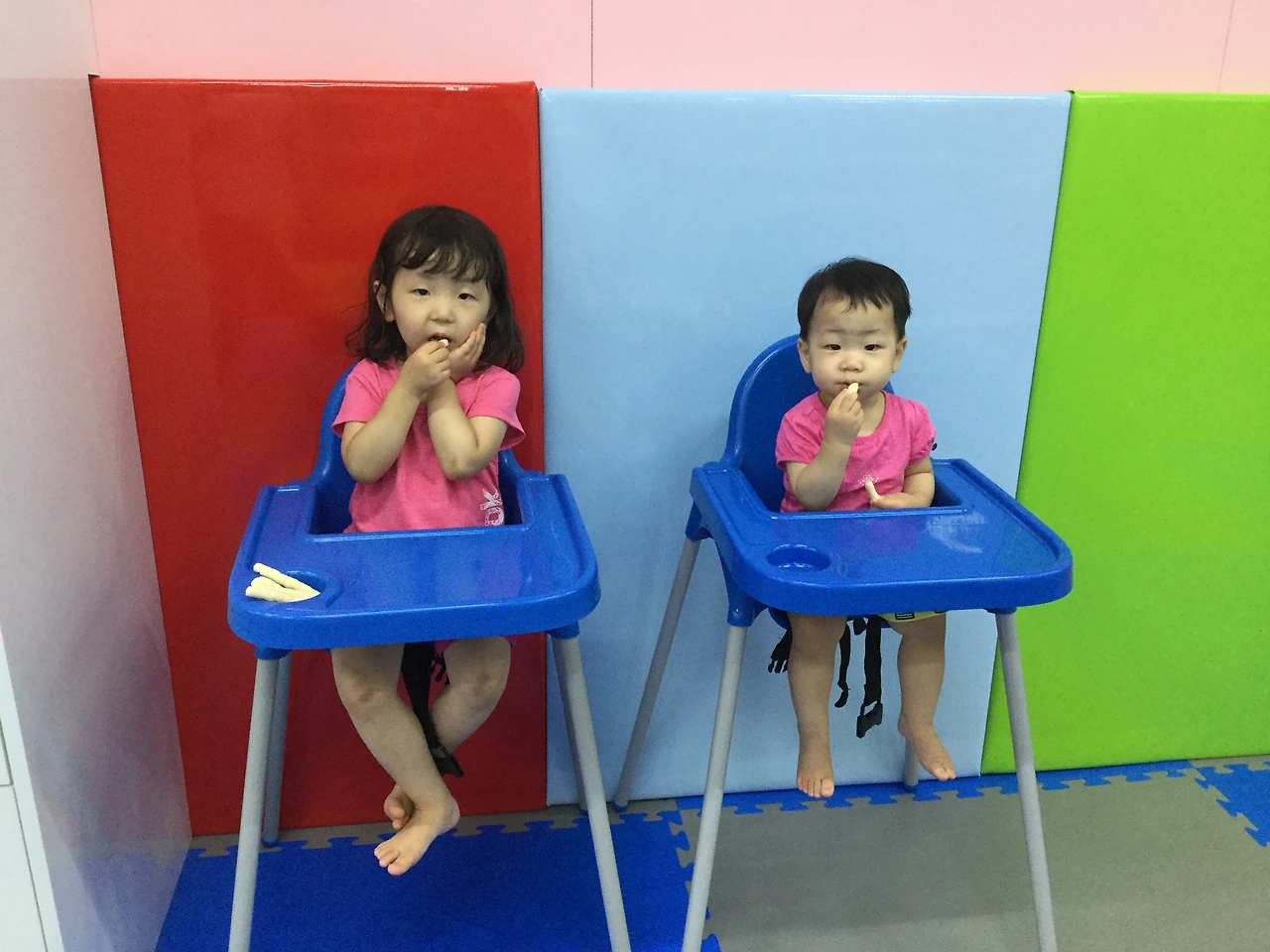 애기의자에 나란히 앉아 아기쌀과자 나눠먹으며 행복한 다라남매.