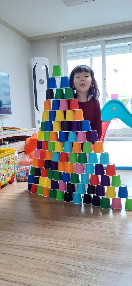 오늘 가장 대박템은 바로 칼라종이컵이었다. 칼리종이컵을 200개 샀는데 다꺼내기에는 너무 많은것 같아서 100개정도 꺼내주었더니 다온이는 유치원에서 해봤다며 컵쌓기를 했다. 그런데 우리 라온이가 그걸 가만둘리가있나. 누나가 쌓기만하면 무너트리기 일쑤. 결국 누나 짜증 폭발. 그래서 중재하고 있던 차에 내가 종이컵을 아이들에게 물뿌리듯이 던져보았다. 그랬더니 그것이 웃겼는지 갑자기 눈싸움도 아닌 종이컵싸움 발발. 진짜 재미있었다. 아이들이 동시에 나에게 종이컵을 던지고 나도 던지고. 이게 근거리에서 던지면 사실 바닥면이 딱딱해서 맞으면 아플텐데, 아이들이나 나나 서로 경계(?)하느라 멀리서 던지니 다치지도 않고 정말 너무너무 재미있었다. 참나, 겨우 종이컵만으로도 이렇게 재미있게 놀수가 있다니. 재미있으면서도 허탈한 마음이 들었다.
