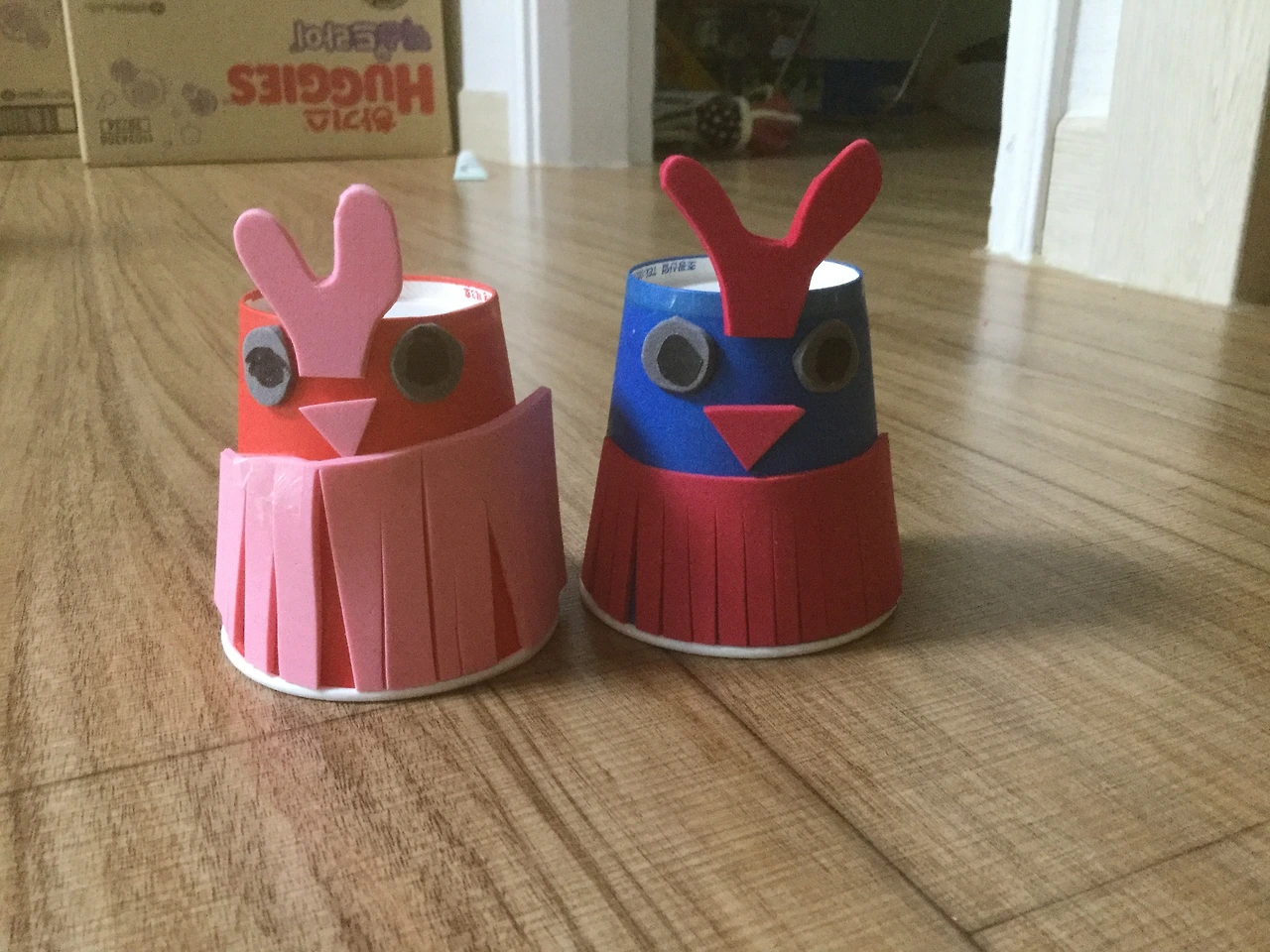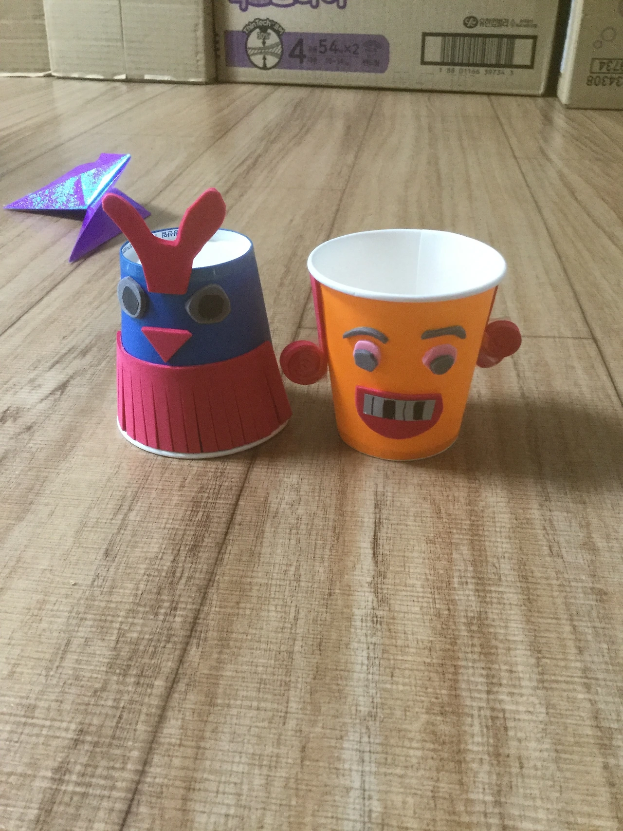 그런다음에는 한숨 돌릴 겸 종이컵이랑 폼페이퍼로 만들기 놀이를 했는데, 오늘은 꽤나 그럴싸한 작품들이 많이 나왔다. ㅋㅋㅋㅋㅋㅋㅋ(온전히 주관적인 기준) 사실 목공풀을 폼페이퍼로 만들기할때 쓰려고 산건데, 폼페이퍼는 목공풀이 아니라 글루건이나 일반 풀로 잘 붙는다는걸 몰랐던 애미의 완전 잘못된 선택이었다. 그래서 12개나 산 목공풀은 현재 서랍에 고이고이 들어가있고, 우리는 글루건이 없기때문에 일반 풀로 열심히 오리고 붙여서 만들었다.