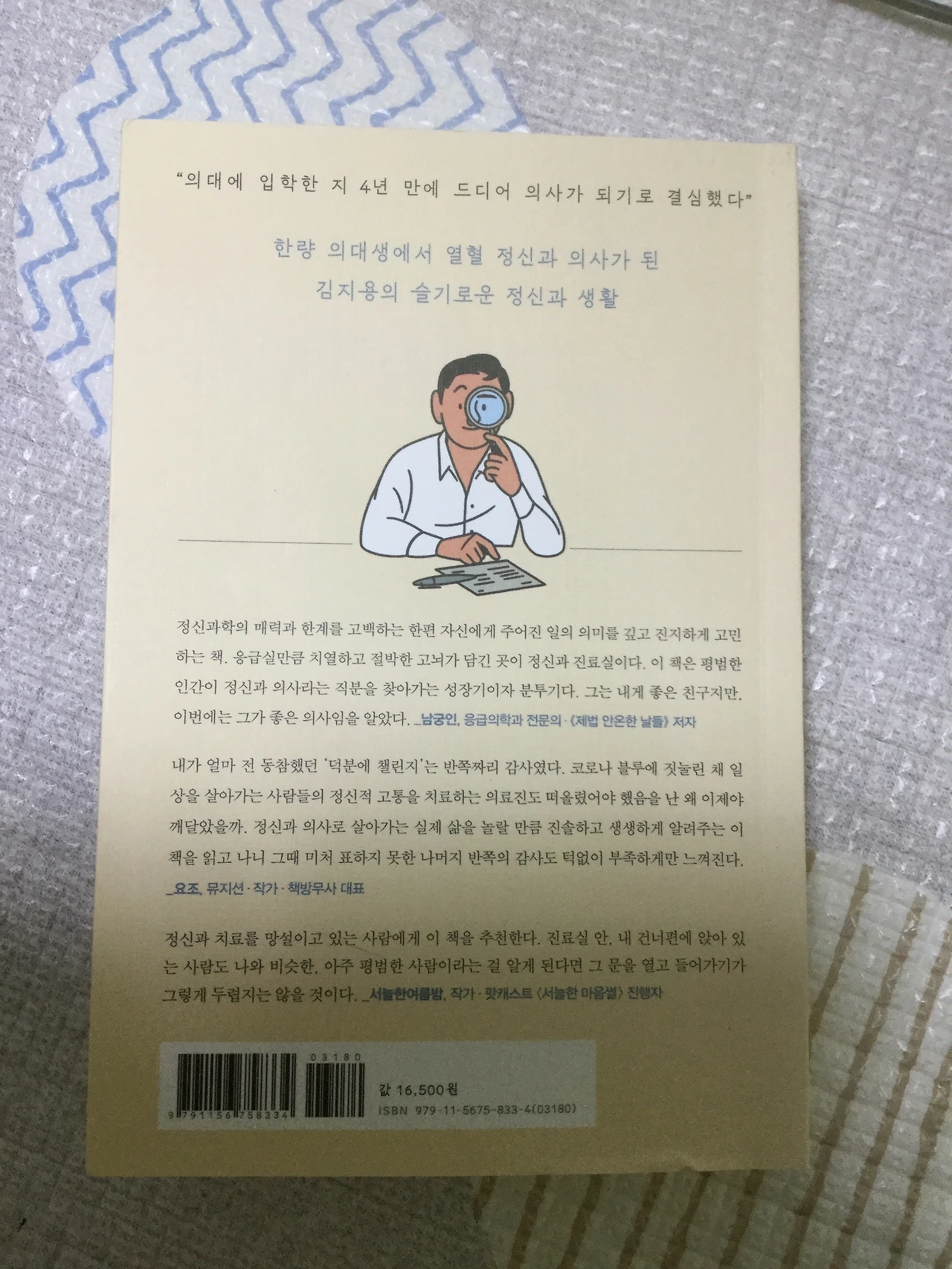 그 이후로도 정신과를 가고 싶었던 나날들을 몇 번 있었으나 비싼 진료비 덕분에 마음을 접곤 했다. 아마 정신과를 한 번이라도 가본 사람이라면 내 말에 공감하지 않을까? 감기가 걸리면 내과나 소아과에 가서 채 만원이 안 되는 금액으로 진료를 받고, 약을 받을 수 있다. 작가는 책에서 정신질환도 하나의 질병이며 다른 질병처럼 진료를 받고 약을 처방받는 것이 당연한 것이라고 말했다. 그런데 그 과정은 같은데 너무 비싸다. 하긴 비단 정신과 진료뿐만이 아니다. 심리치료, 심리상담, 마음건강, 등등 정신과 마음에 관한 모든 행위는 다 비싸다. 육체적으로 아픈 것보다 마음이 아픈 게 훨씬 심각하다는 것을 증명이라도 하려는 듯이, 내 마음이 아프고 정신이 아플 때는 많은 돈이 필요로 하다.