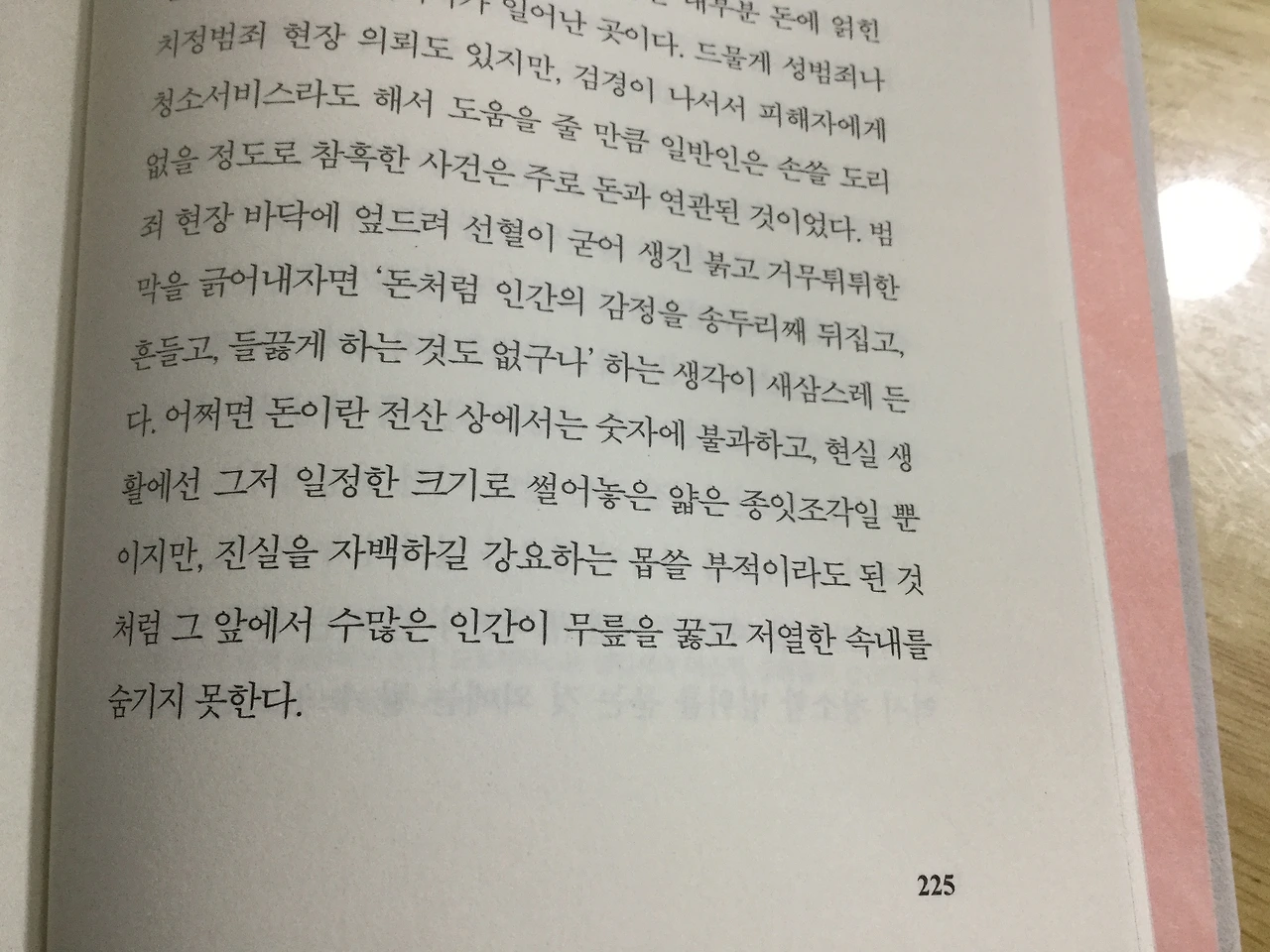 그래도 다행히(?) 겨우 두장이다. 두장인데도, 아마 사진 속 글귀를 읽은 사람 중에는 분명 이 책 전체가 궁금한 사람이 생길 것 같다. 그만큼 강력하고, 날카롭다. 그리고 인정할 수밖에 없다. 정말 돈으로 인해 억울하게, 혹은 비참하게, 처절하게 죽어간 사람이 얼마나 많을지 가늠조차 되지 않는다. 돈이 뭐길레. 돈이 진짜 뭐길레.