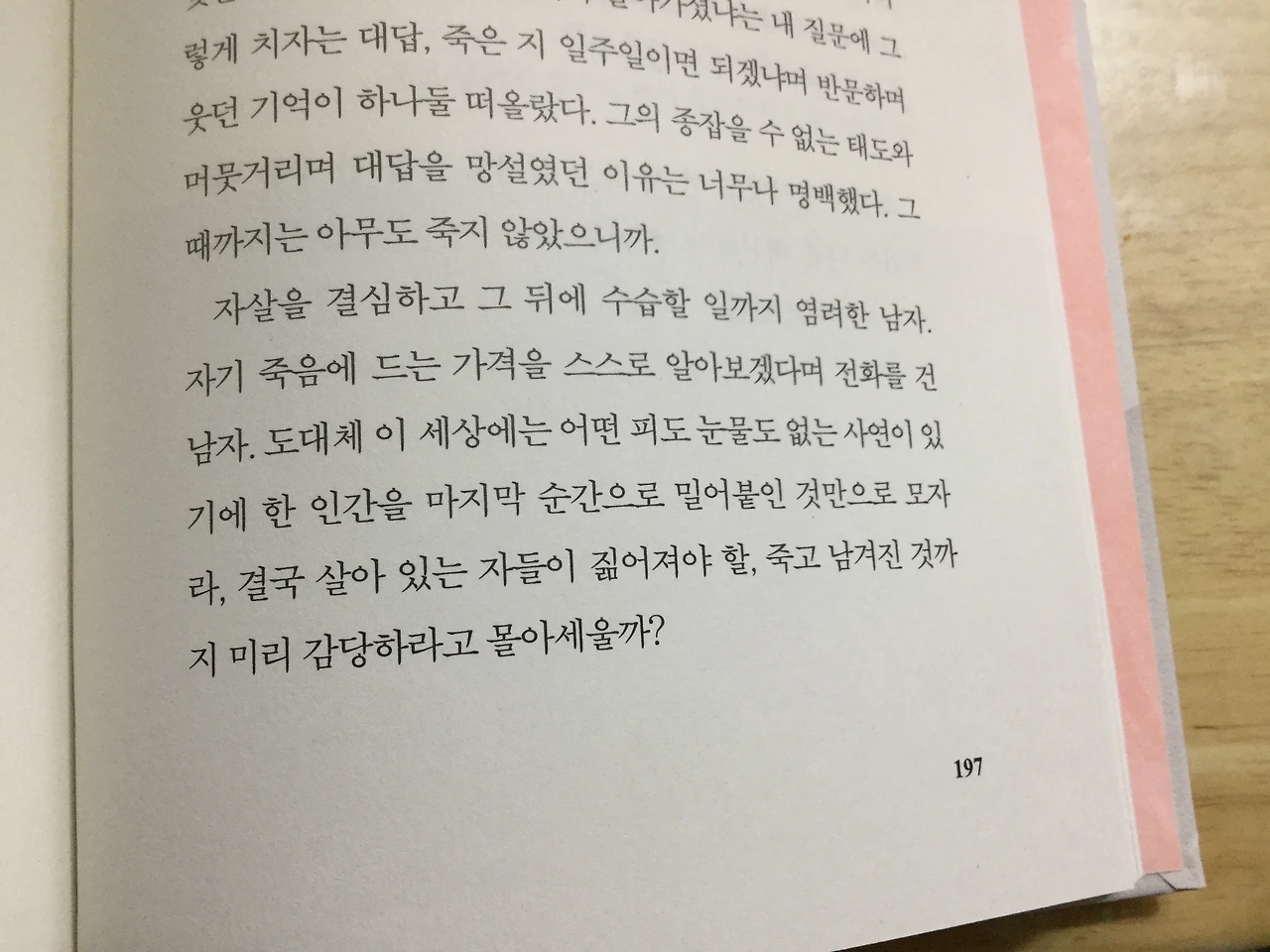 나 역시 여운이 오래가는 성향이라 작가가 자살한 사람들과 고독사 한 사람들의 흔적이 남겨진 부분을 설명한 그 대목이 아직까지 잊히지 않아 기분이 씁쓸하고 찝찝하기 때문이다.