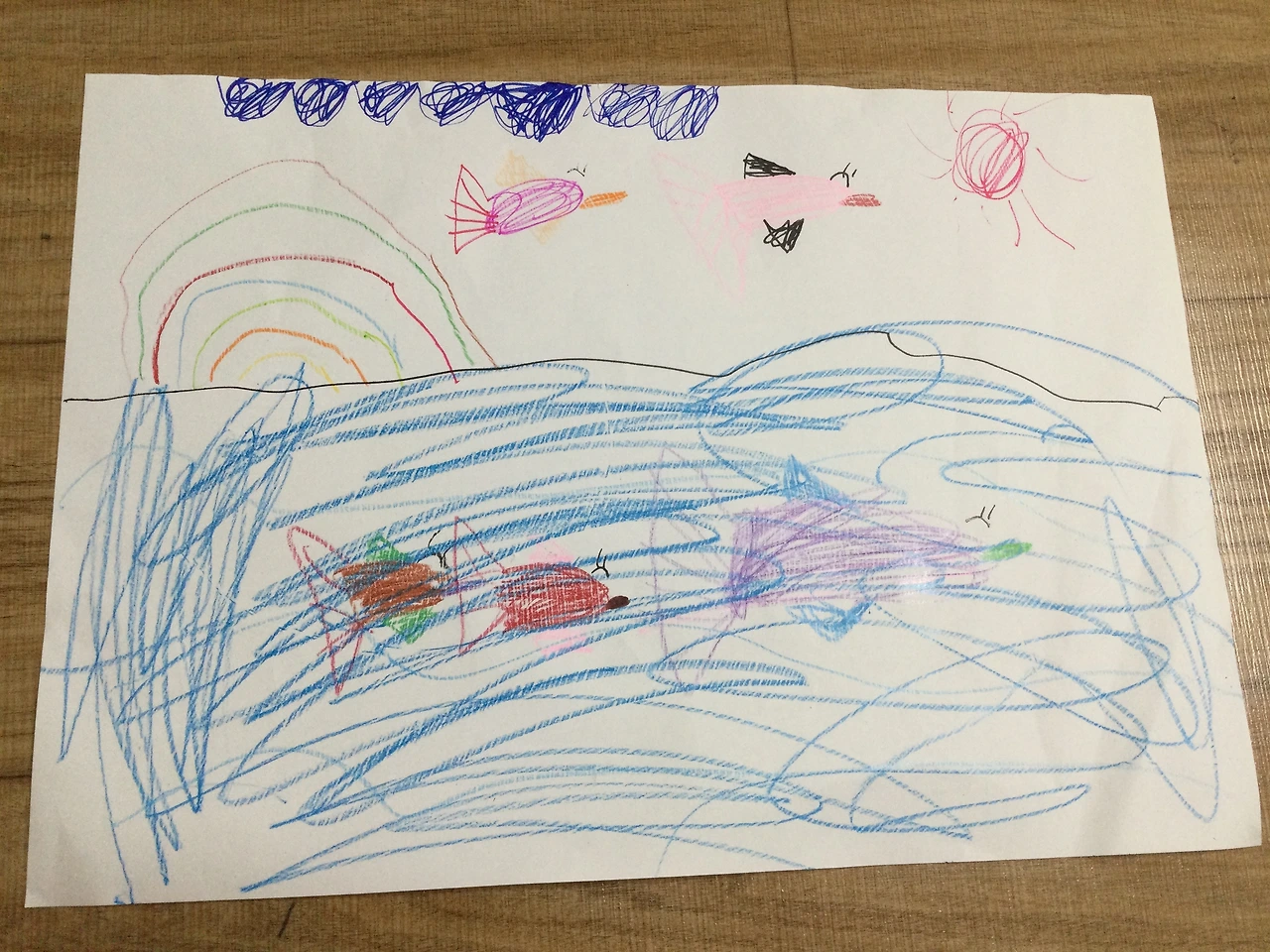 돌고래 조련사 체험에 이용되던 돌고래 두 마리가 이미 죽었다는 얘기를 흘리듯 했는데 아이는 그것을 기억해서 그림으로 표현해주었다. 비록 하늘나라에 갔어도 그 돌고래들이 행복하길 바라는 걸까. 아이는 무지개도 함께 그려주었다. 순수하고 예쁜 우리 다온이의 마음이 너무너무 사랑스러웠다.