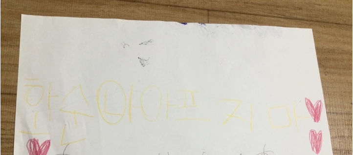 그런데 다온이가 움직이기 시작했다. 갑자기 뭐가 생각난 듯 종이와 색연필을 가져다가 그림을 그리기 시작했다. 나는 옆에서 그저 바라만 보았다. 평소에 그림을 그릴 때 거침없이 그려내는 다온이 답게 지금 당장 떠오른 영감을 놓치면 안 된다는 듯이 정말 쓱쓱 그려냈다. 그리고 짜잔 하고 보여준 그림은 정말 감동 그 자체였다.