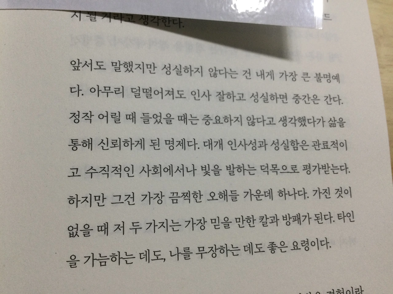 그 인성에는 작가가 말한 인사성과 성실함이 분명 내포되어있을 것이다. 하지만 시대가 변하고 있다. 요새는 성실함보다는 유능함을 많이 추구하는 듯하다. 최근에 이런 말을 들었다. "열심히 하지 말고 잘하란 말이야." 정말 여러모로 살기 힘든 세상이다.