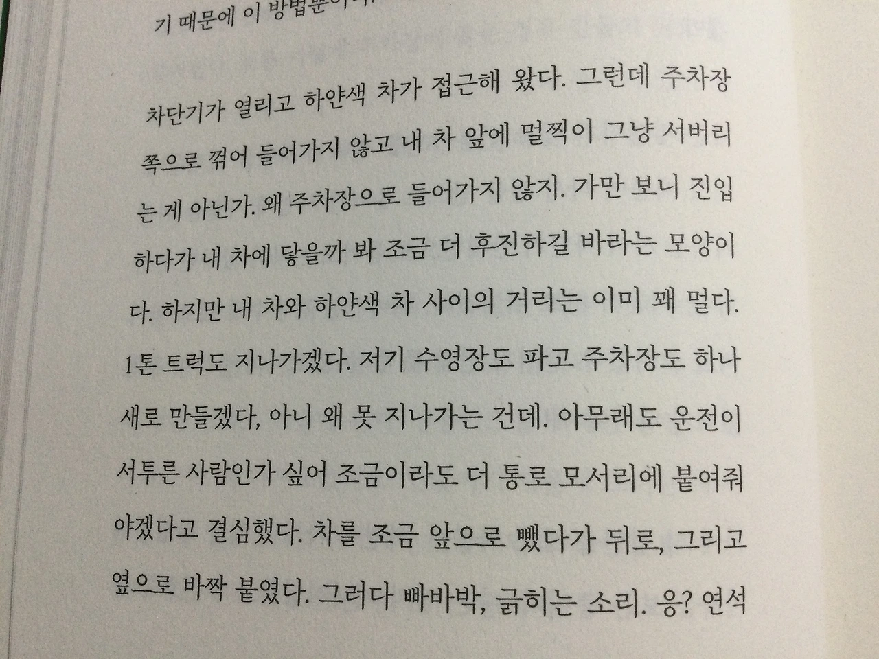 중간중간에는 재미있는 에피소드도 있었다. 특히나 저 하얀 차 에피소드는 내가 초보운전이라 더 공감했다. 그래도 하얀색 차주인은 허지웅 작가를 만나 얼마나 다행인가. 웬만한 차주인 같으면 당장 뛰쳐나와 자기 차를 한 번 보고 하얀색 차주인에게 욕을 해도 했었을 텐데.