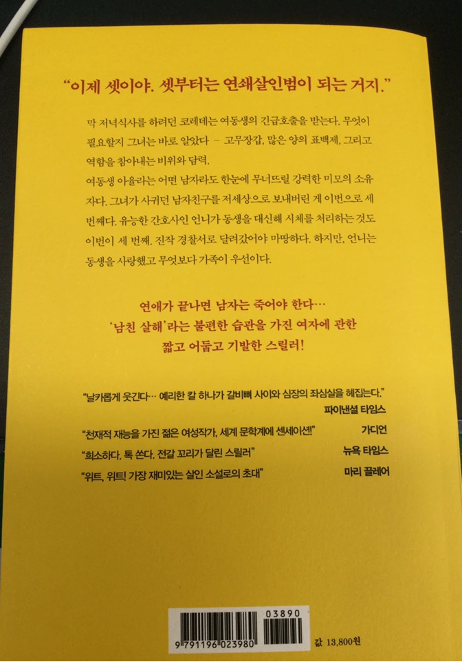 책 표지에 나오다 시피 이 책은 장난처럼 살인을 하는 동생과 죄책감을 안고서도 동생을 지키기 위해 살인 현장 뒷수습을 해주는 언니의 이야기이다. 누가 봐도 홀릴 정도의 미모를 가진 동생과 그렇지 못한 언니. 그 언니가 사랑한 사람과 동생과의 관계. 책을 한참 읽다 보면 우리가 생각하듯이 모두가 다 파국으로 치닫거나, 아니면 다행히 전부 다 파국은 피해 가거나, 아니면 동생이 뉘우치거나, 언니가 양심에 가책을 이기지 못하고 자기 손으로 동생을 바른길로 이끌거나 하는 여러 가지 결말을 상상하게 된다. 하지만 이 책이 흥미로웠던 건 그 모든 예상을 비껴간다는 것. 그렇다고 엄청난 결과가 있는 건 아닌데 이상하게 그냥 수긍하게 되는 결말이다. 그게 이 책의 매력이라면 매력일 것이다.