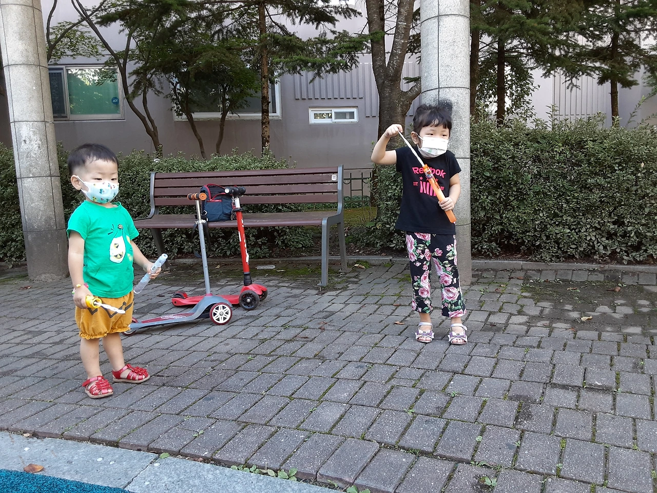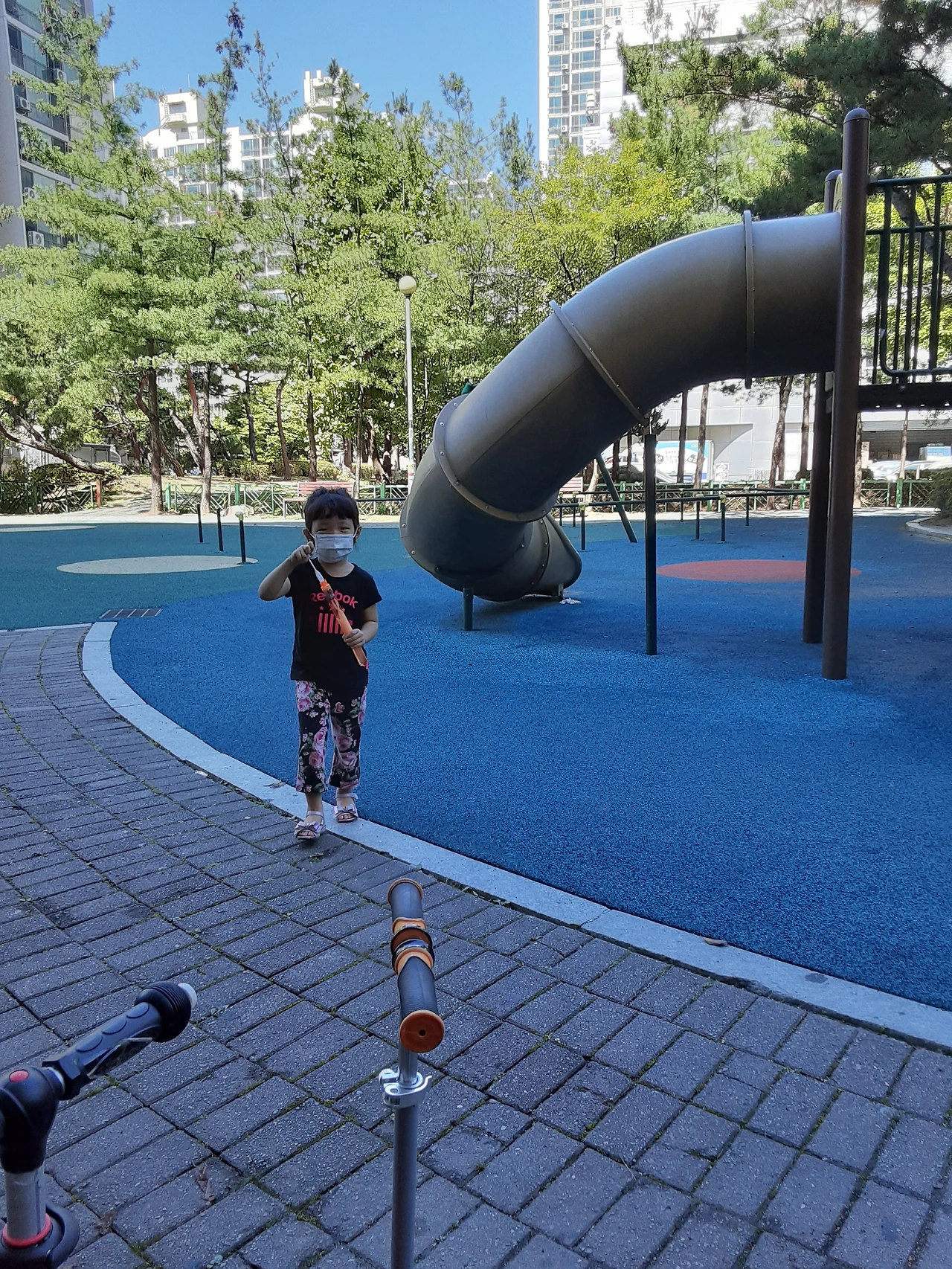 다행히 놀이터는 그늘이었고 연휴답게 아무도 없었다. 평소에는 유아들부터 초등학생들까지 가득가득해 좁아 보이던 놀이터가 탁 트이자 우리 애들은 킥보드로 신나게 달리기 시작했다.