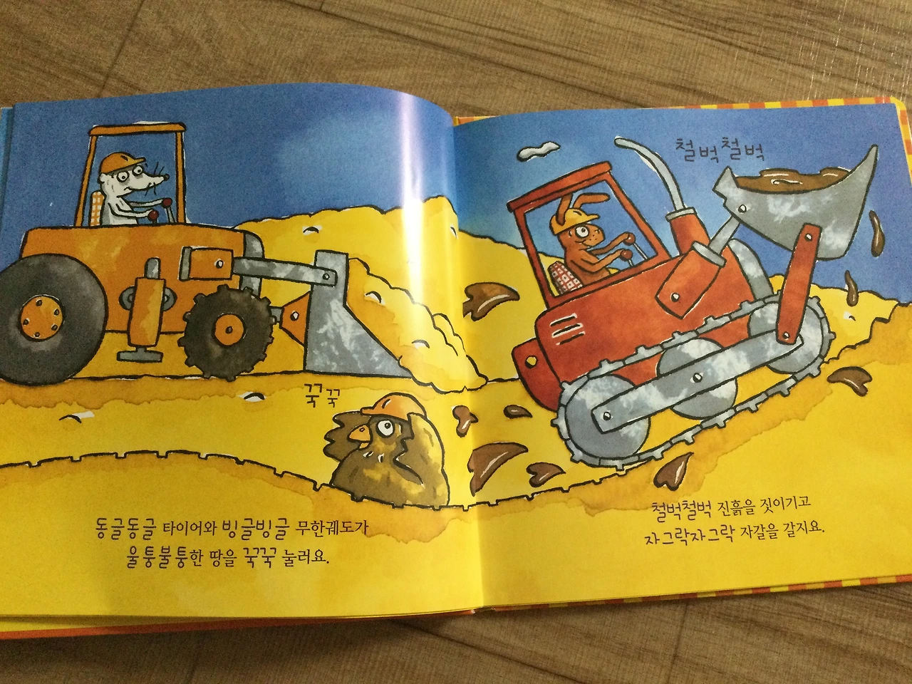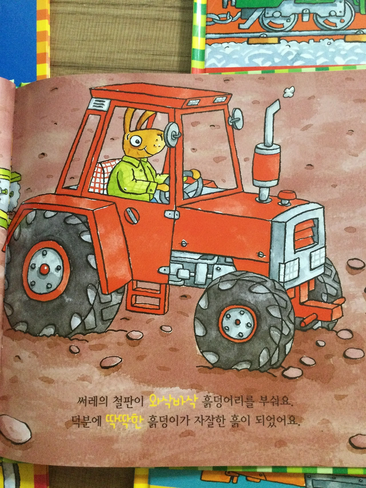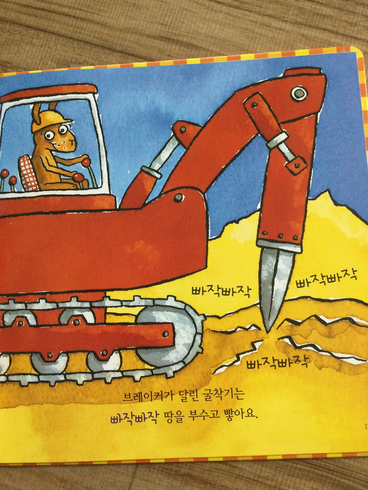 그래서 스트레스는 스트레스대로 받고, 걱정은 걱정대로 하던 어느 날 라온이는 변함없이 이 책들을 가지고 왔고 읽어주는데 갑자기 주황 글씨가 확 눈에 띄는 것이 아닌가. 이 책이 좋은 점은 의성어, 의태어들이 많은 것뿐만 아니라 눈에 확 띄게 표시해놨다는 것이다. 백문이 불여일견. 라온이는 모든 책을 다 좋아했지만 그중에 가장 좋아했던, 소방차/ 굴착기/ 트랙터의 몇 장들을 사진 찍어 보았다.