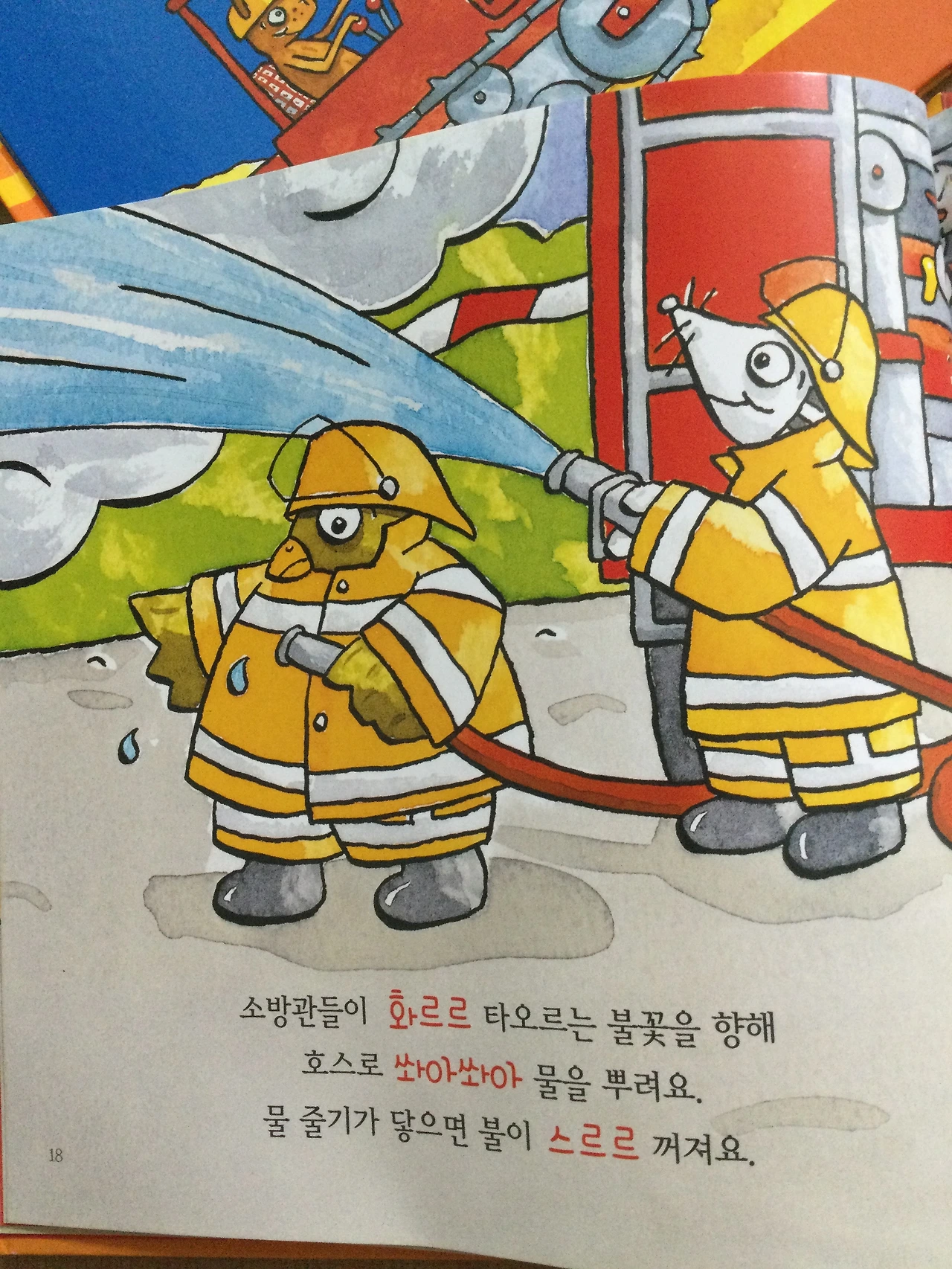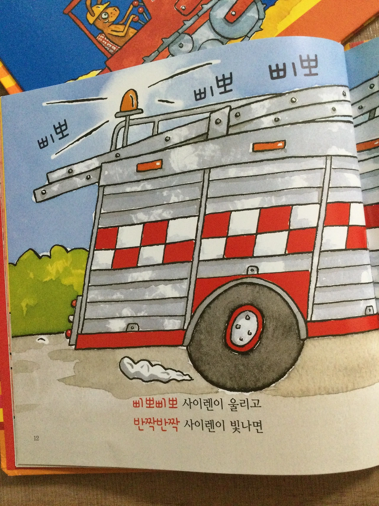 이 책들 덕분에 일상 대화 속에서 의성어 의태어를 써야 하다는 강박에서 많이 벗어났다. 대신에 책을 읽어줄 때 더 실감 나게 의성어 의태어들을 몸짓까지 이용하여 읽어준다. 아직 라온이에게 "이거다!" 하는 효과가 나오지는 않지만 요새는 소방차편에 "호스를 돌돌돌 말아요"라고 하면 "똘똘 똘똘"하고 따라 하기도 한다. 흐뭇하기도 하고 어찌나 귀여운지 사랑이 퐁퐁 솟는 느낌이다.