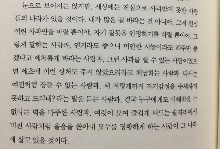 그리고 그런 글들 중에서는 상처를 드러내는 글들이 많다. 이렇게까지 다 공개한다고...? 당황스러울 정도의 글도 있고, 참 애잔하고 애잔하다 하고 느끼는 글도 있고, 버틴다는 것에 대해 다시 생각해보게 하는 글도 있다. 그리고 이 책의 저 문단을 읽으면서 모두가 작가가 말한 사과받지 못한 나라에 같이 들어가면 다 같이 서로의 상처를 보듬고 살아갈 수 있을까 생각했다. 지금껏 살면서 학창 시절 내내 외로웠던 내 삶이 가장 고통스럽다고 생각했는데 그것이 오만이었다는 것을 브런치를 통해 느끼고 있다.