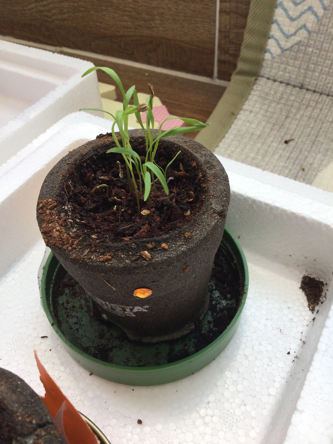 그래서 별 기대 없이 바질씨앗들이 싹이 피우지 못한 여분의 커피 화분(커피 찌꺼기로 만든 친환경 화분)에 당근 씨앗을 엄지 손가락만큼 뿌렸다.
