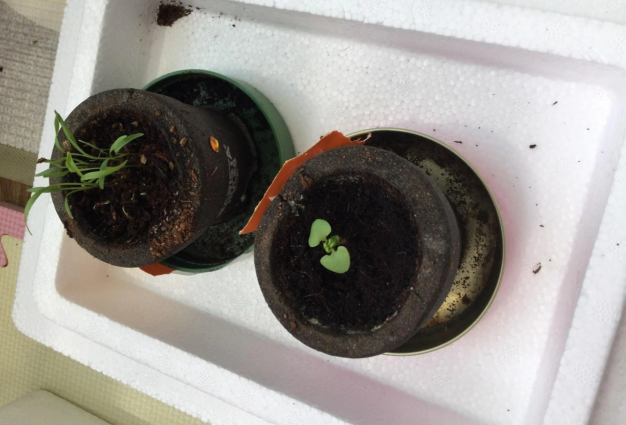 그리고 기다리길 며칠째, 역시나 아무 소식이 없었다. 너무 작은 화분에 터무니없이 많이 뿌렸으니 그럴 만도 하다.. 하고 지나쳤는데 오잉!? 어느 날 다른 화분에 물을 주러 아이들과 나갔는데! 헉! 싹이 난 것이다! 그것도 하나가 아니라 엄청 여러 개가! (위의 난같이 생긴 것이 당근 싹)