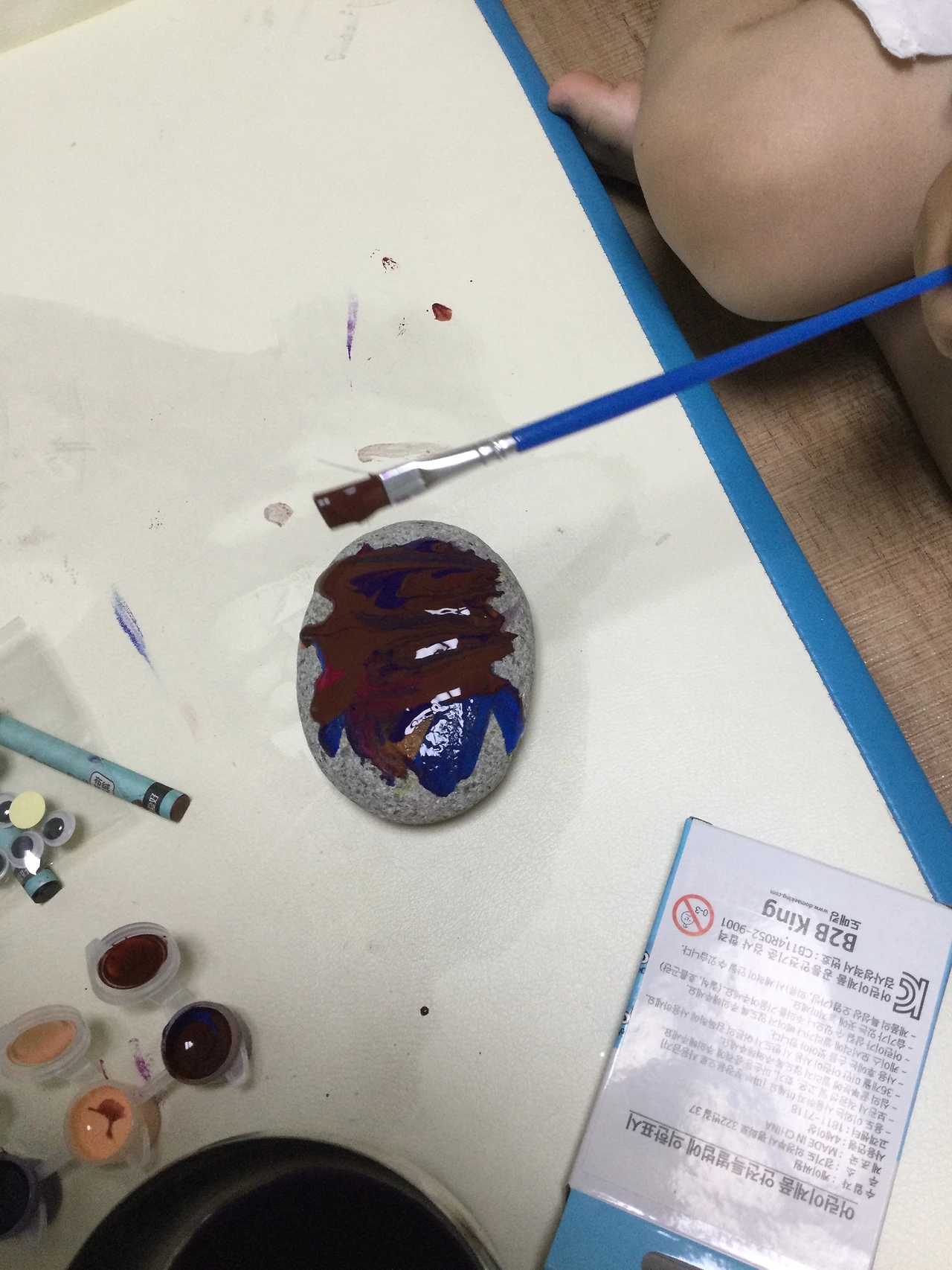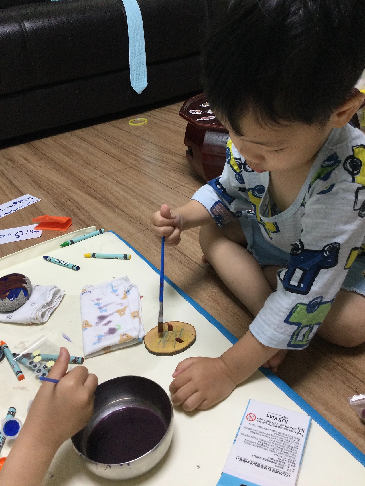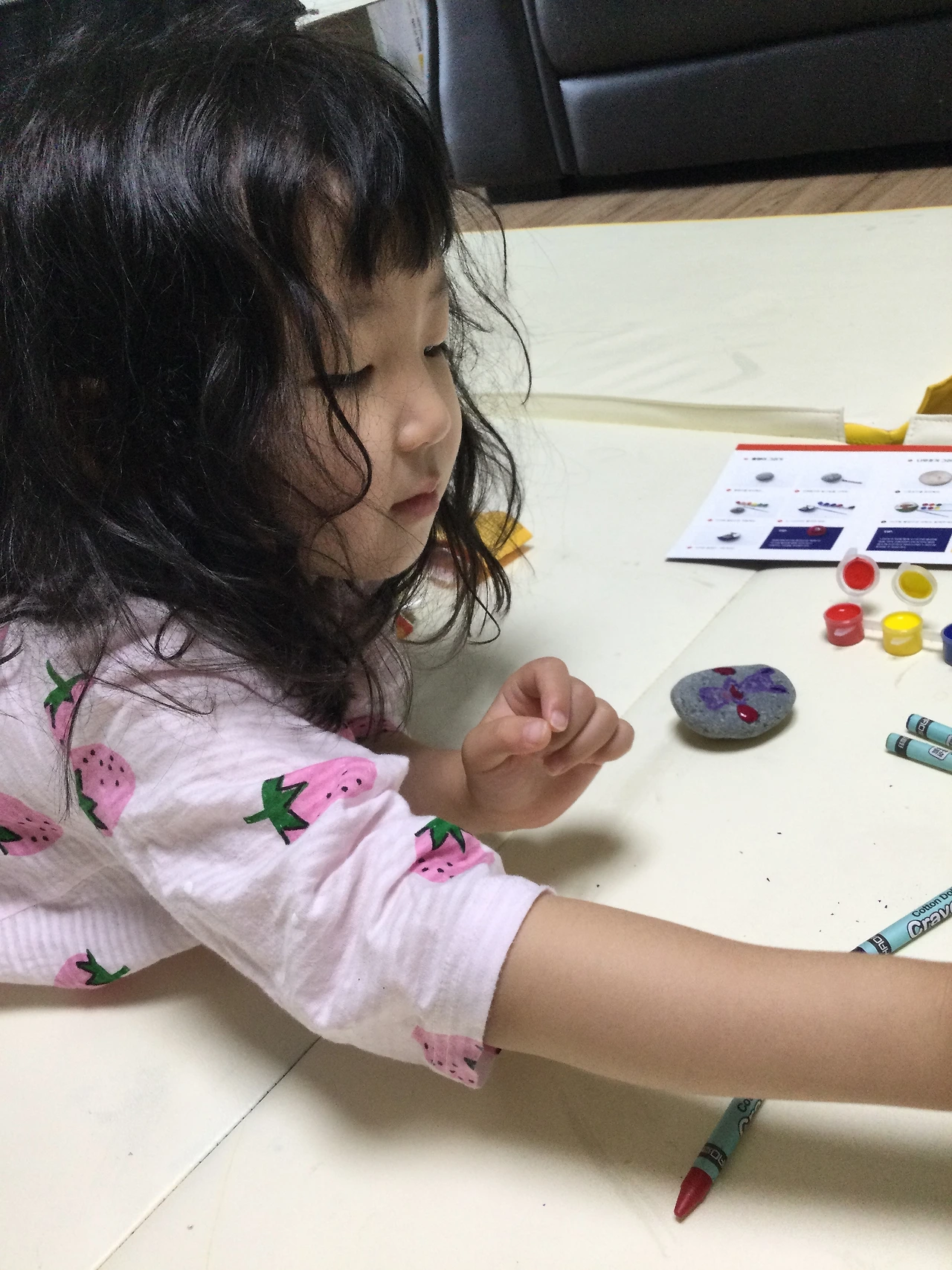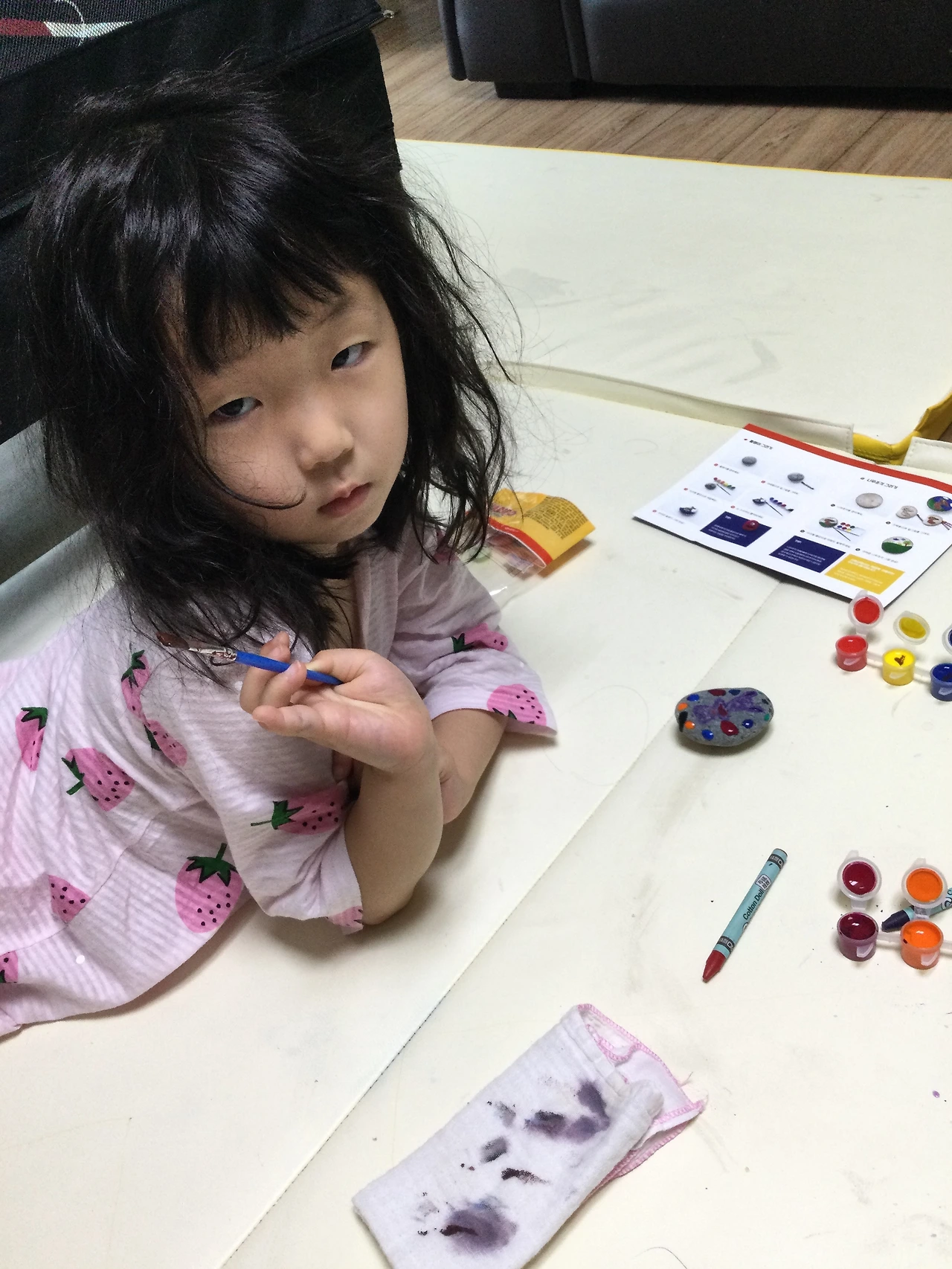 그런데 아쉬웠던 점은 분명 우리 둘째(4살) 이름으로 온 키트였지만 둘째가 흥미를 가질만한 것이 없었다는 것이다. 미술에 지대한 관심을 가진 남자아이들도 분명 있겠지만 우리 아들은 아니었다. 우리 아들은 변신로봇, 공룡, 블록, 킥보드와 같은 놀이들을 좋아하기에 처음 개봉한 돌멩이와 나무에 그림 그리는 키트는 완전히 취향저격 실패였다. 초반에는 누나를 따라서 집중하는 듯했으나 결국에는 붓으로 슥슥슥 칠하고 자리에서 일어났다. 반면 우리 딸은 평소 그림 그리는 것도 좋아하고, 꾸미는 것도 좋아해서 한동안 자리에서 밑그림도 그리고 색칠도 하며 키트를 한껏 즐겼다.