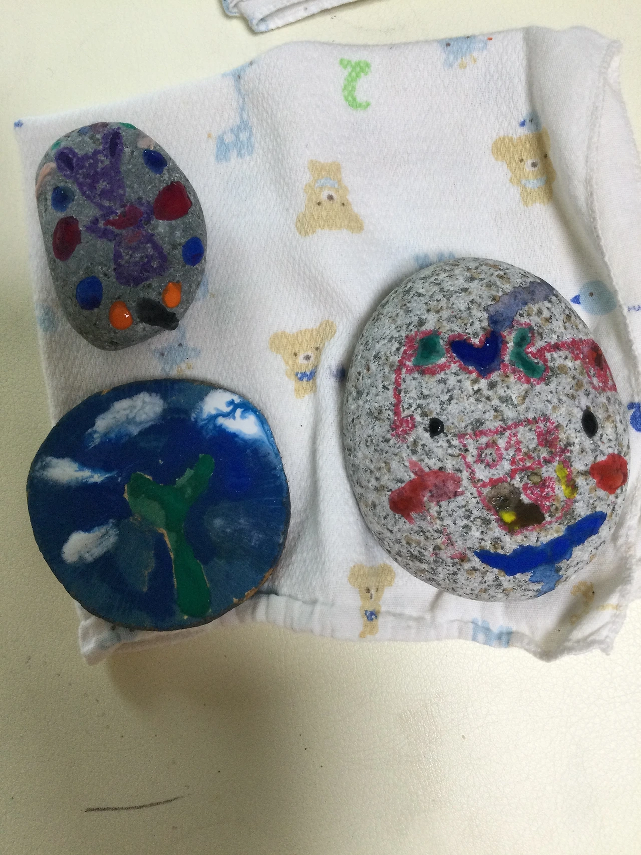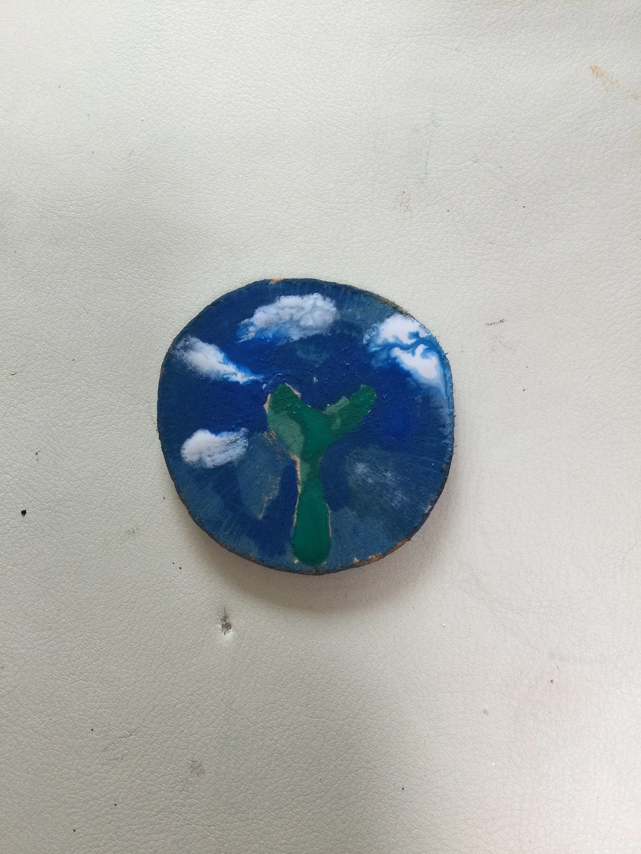 딸의 돌멩이 작품은 설명을 들었는데도 무엇을 표현하고자 하는지 정확히 모르겠어서 적당히 호응해주고 넘어갔다. 그런데 나무에 그린 그림은 너무 남달랐다. 나무와 하늘과 구름. 저절로 감탄사가 나왔다. 무엇보다 놀랐던 건 구름을 표현한 감각이었다. 파란색으로 바탕을 다 칠한 딸은 아주 조심스럽게 하얀색 물감을 붓에 묻혀 조심스럽게 터치했다. 물감이 다 마르기 전에 모습이 더 실감 났지만, 마른 후에 그림도 너무 아름다워 독사진을 찍고 있으니 딸이 와서 "엄마 이거 마음에 들어?"하고 물었다.