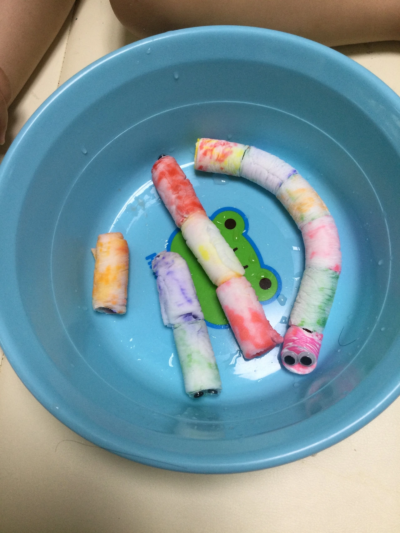물을 한껏 머금은 코인 티슈 애벌레들은 자체 분리되기도 했다. ㅎㅎㅎ 모든 과정에서 영 탐탁지 않은 반응을 보인 아들도 물을 뿌리면서는 꽤나 즐거워했다. 무엇보다도 세 개씩 분리해서 두 마리의 애벌레를 만든 누나와는 달리 여섯 개를 다 이어 붙여 만든 아들의 애벌레가 물을 먹으니 가장 길어져서, 자신이 1등을 했다며 신나 하는 모습을 보며 이 녀석의 승부욕은 알아줘야겠다는 생각이 들었다. ㅎㅎㅎ