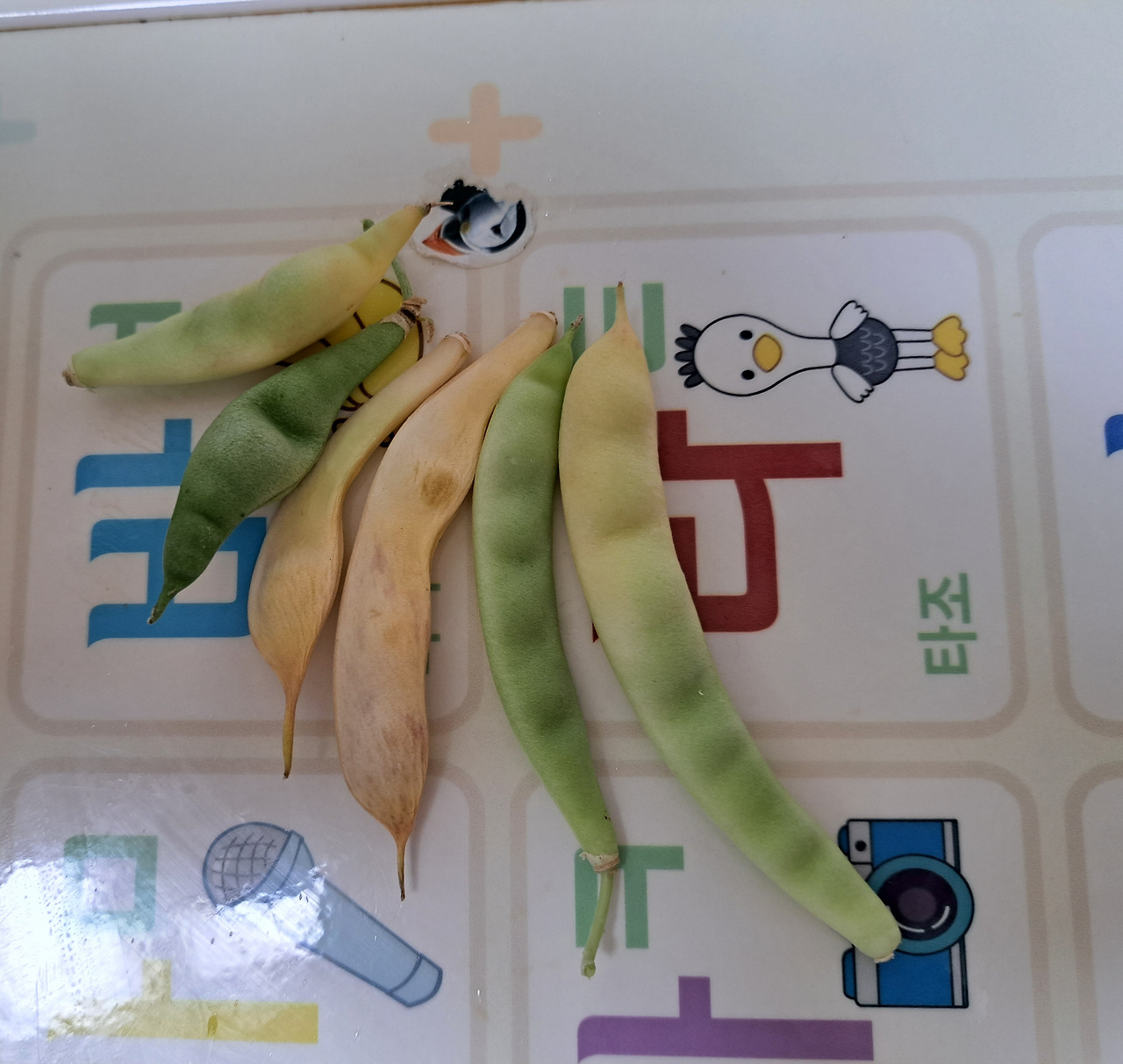 개중에는 잘 익은 콩도 있었고, 아직 익어가던 콩도 있었고, 몸집을 채 불리지 못한 채 이제 막 탄생한 듯한 모습의 콩들도 있었다. 총 9개의 콩이 수확되었다. 어제 4개까지 합치면 12개. 두 달간 마음을 다해 키운 것 치고는 수확이 너무 소소해 보일 수 있지만 나는 이렇게라도 아이들에게 꼬투리를 따고, 열어볼 수 있는 시간을 가지게 해 주었으니 만족한다. 게다가 늘 느껴왔듯이 콩 한알이 지지대 두 개를 필요로 할 만큼 쑥쑥 자라 잎사귀를 사정없이 갉아먹는 벌레의 습격도 이겨내고 꼬투리를 7개나 맺은 건, 정말 생명이기에 할 수 있었던 위대한 여정이 아니었을까.