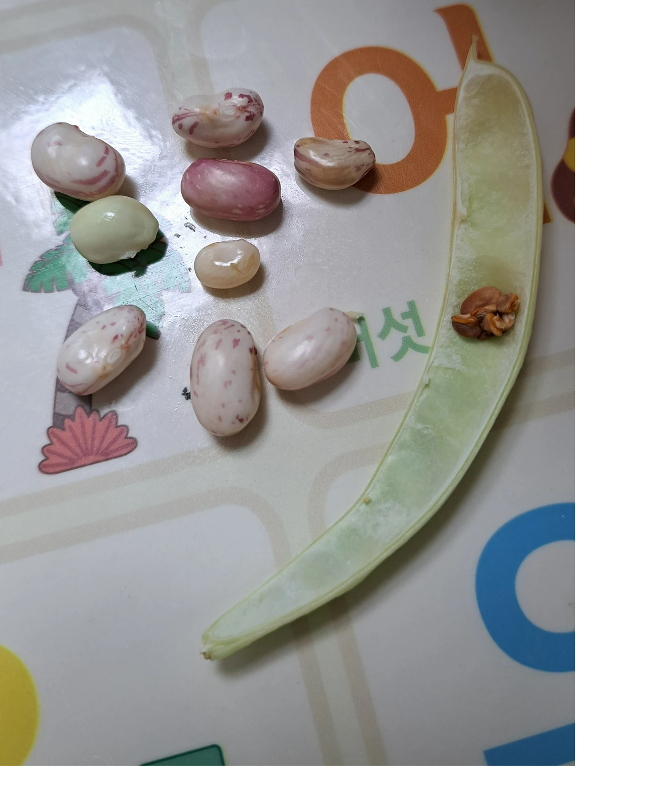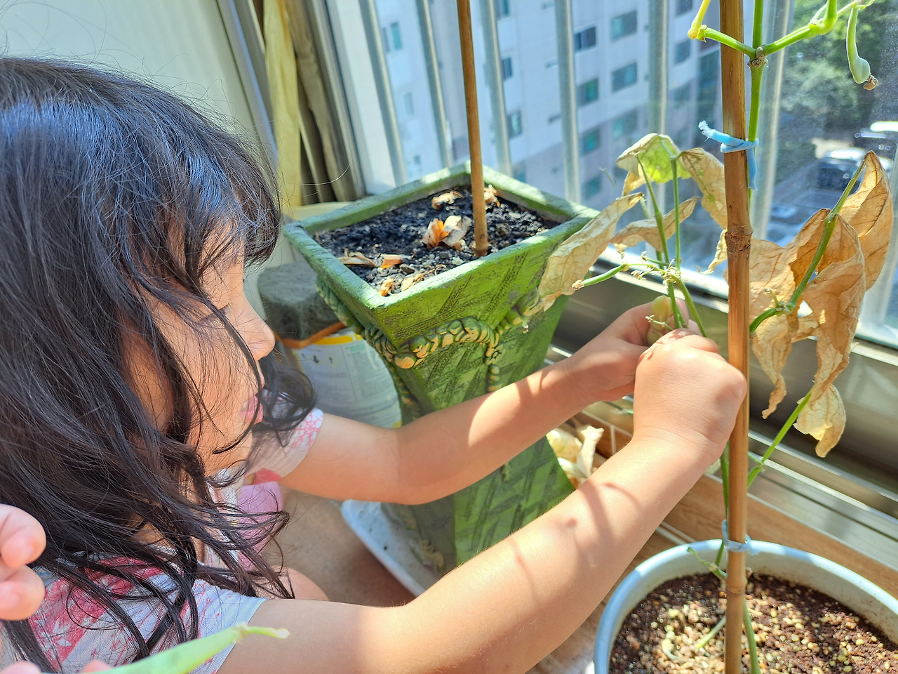 가장 빠른 성장과 튼실한 모습을 보였던 꼬투리는 안에 네 알의 설익은 콩을 품고 있었다. 수확은 내가 했지만 꼬투리를 여는 것은 딸에게 부탁했다. 딸은 신나서 열었고 콩이 네 개나 나왔다며 좋아했다. 평소에도 콩을 좋아하는 딸은 한 손의 손가락 개수만큼도 못하는 네 알의 콩을 밥에 퍼주자 마자 쏙쏙 빼먹었다. 나도 한 알 맛보고 싶었는데.. 그렇지만 딸의 한마디에 아쉬운 마음이 사르르 녹았다.