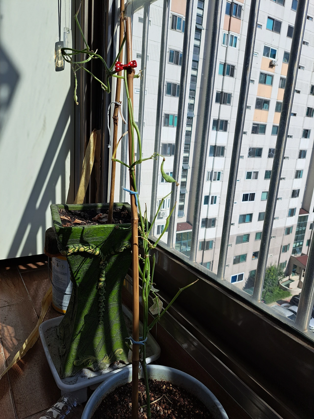 긴 휴가를 다녀오며 가장 걱정되었던 건 바로 식물들이었다. 엄마가 하루 들러 물을 주셨다고는 했지만 매일매일 물을 주다가 갑자기 3일에 한번 주는 꼴이 되었으니 과연 잘 버티고 있었을까, 햇빛이 너무 강한데 급격히 마르고 있는 건 아닐까. 별의별 생각이 다 들었다. 그래서 집에 돌아오자마자 짐 정리를 하고 베란다로 향했다. 다행히 엄마의 손길로 다른 아이들은 멀쩡해 보였다. 나의 강낭콩만 빼고.