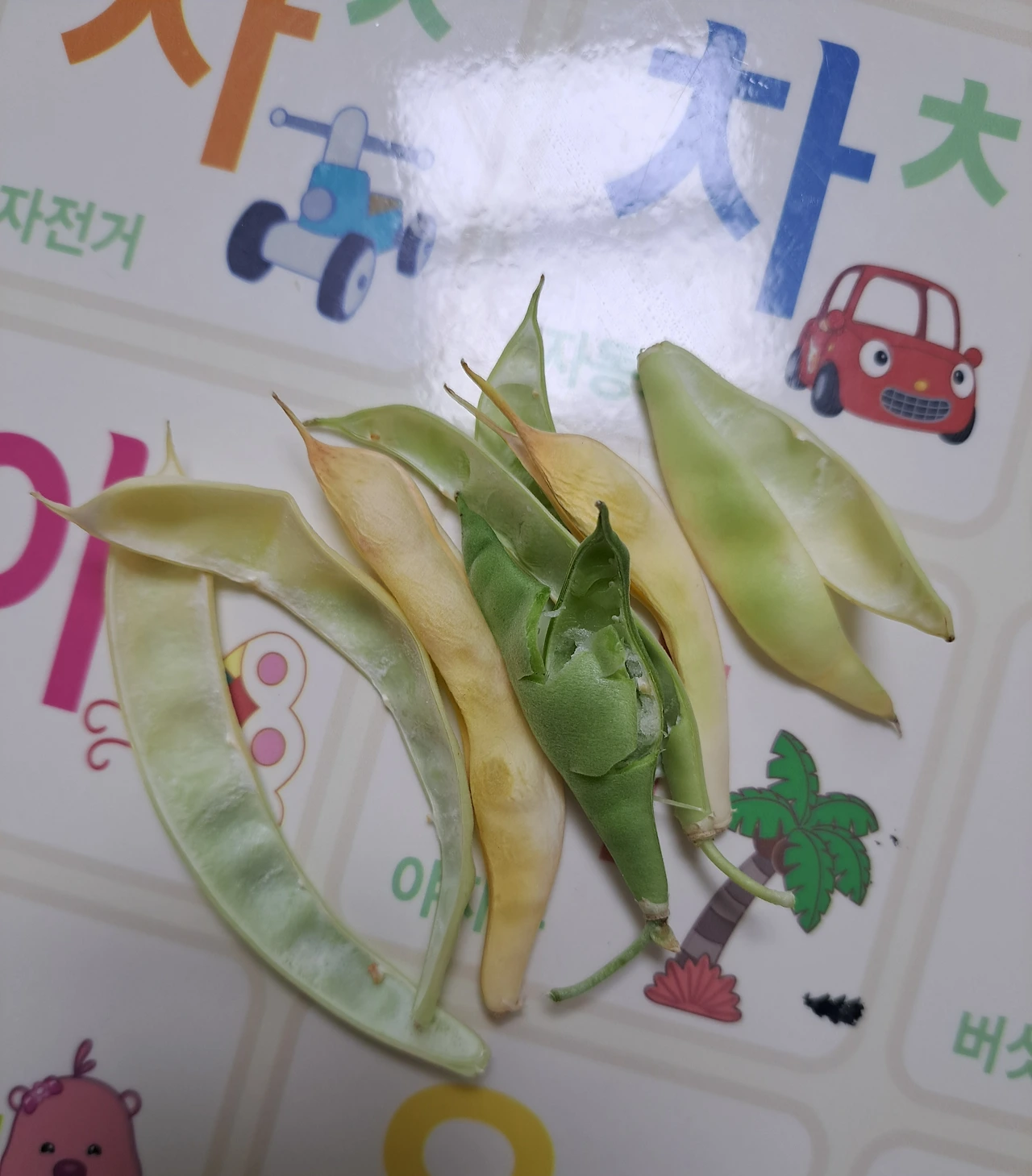 아들이 꺼낸 가장 잘 익은 콩 하나와, 가장 익지 않았던 시퍼런 콩 두 개는 그렇게 나와 아들의 입속으로 들어갔다. 딸의 아쉬움이 표정에서 가득 드러났지만 여하튼 키운 사람은 나인데 나도 하나 먹어봐야 하지 않은가. 그 와중에 자기가 수확한 콩도 안 먹겠다는 우리 아들에게 콩 한번 먹여보겠다고 이거 먹으면 영상 틀어줄게.라는 딜을 한 나란 엄마. 참 애쓴다. 우리 아들은 영상을 보기 위해 억지로 입에 콩을 넣고 오물오물 씹었다. 표정이 애매해서 "맛없어?"라고 물었더니 "맛이 없는데 맛이 있어"라는 희망적인 대답을 내놓았다! 오~~ 좋아... 강낭콩 한번 더 키워? (아서라..)