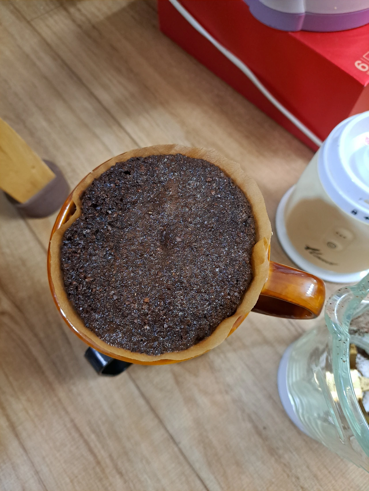 육안으로는 아주 균일하게 갈린듯한 커피를 드리퍼에 넣었는데 생각지도 못한 난관에 부딪혔다. 나는.. 드립용 주전자가 없던 것이다! 두둥..... 나에게 있는 것이라고는 뭉툭하고도 무거운 커피포트뿐.. 오. 마. 이. 갓. 하지만 여기서 포기할 수는 없다. 믹서기도 해냈는데 커피포트라고 못해낼 것이 무엇이 있겠느뇨!? 커피포트로 내려보자. 물까지 담겨있어 어마 무게 한 무게의 커피포트 때문에 저절로 떨리는 팔을 겨우 부여잡고 원 그리기 도전! 오 괜찮은데!? 무게 때문에 자꾸 원이 찌그러지긴 하지만 괜찮아 괜찮아.