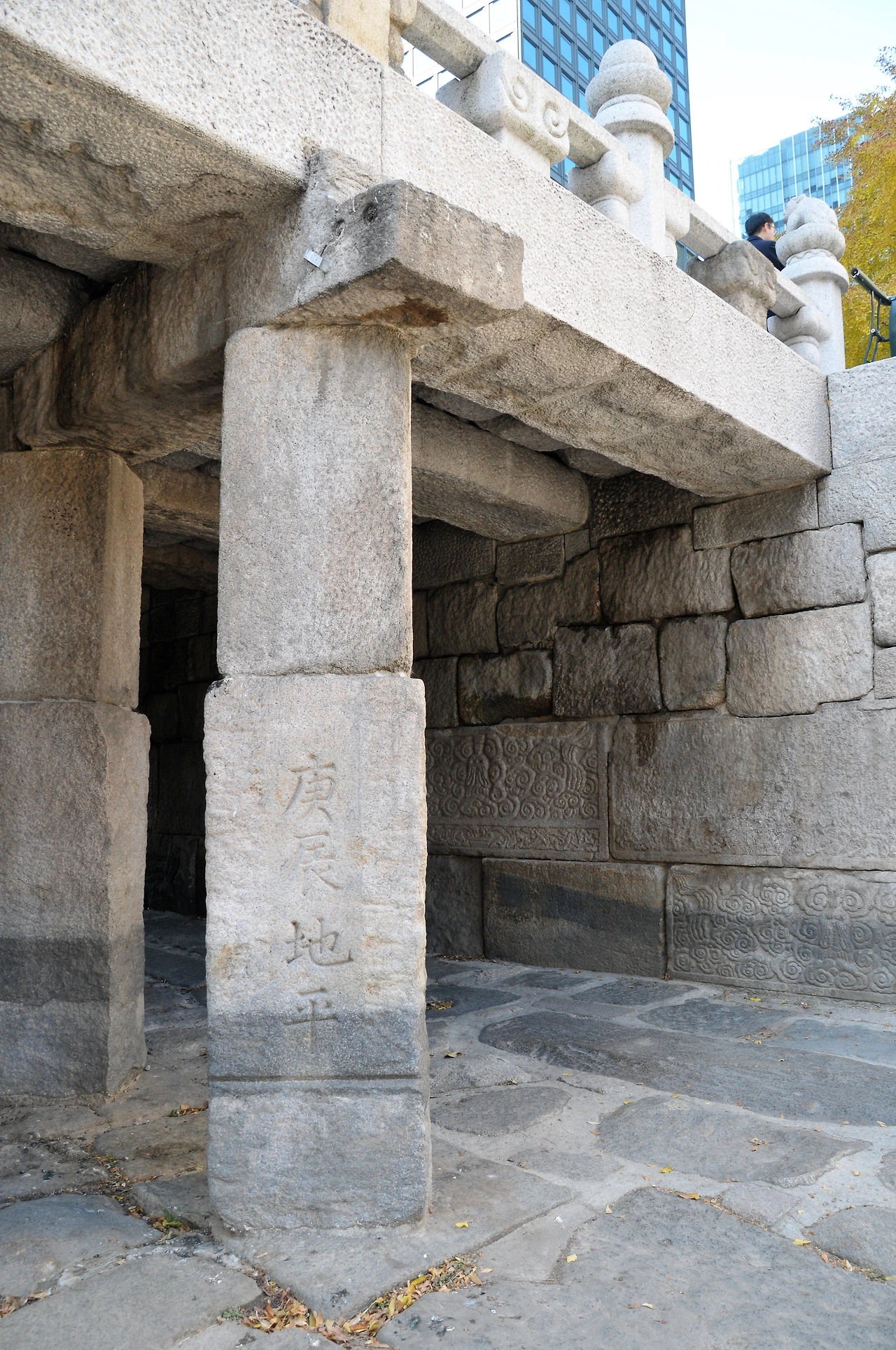 "경진지평(庚辰地平)이라는 글자가 새겨져 있는 기둥이 있다고. 영조대왕이 경진년(1760년)에 청계천의 홍수 조절을 위해 청계천 바닥에 쌓인 흙을 긁어내는 대규모 준설 공사를 한 후 세운 것이야. 준천사(濬川司)라는 관청을 두어 청계천 관리를 하도록 했다고 하는데 만약 이 글자 위로 흙이 쌓이면 관리를 안 한 것이니까 바로 인사조치를 했다고 하지."