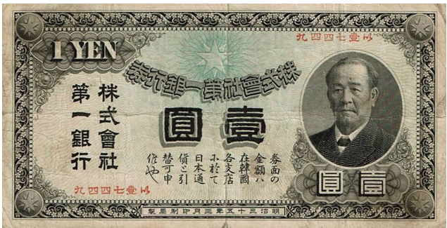 "그래서 개항 후 1878년에 일본제일은행(日本第一銀行;다이이치긴코)이 부산에 지점을 설치하고 관세를 취급하기 시작했어. 조선에는 관세를 취급할 수 있는 전문가들이 없었거든. 일본이 그런 기회를 놓칠 리 없지. 민간 은행이 관세 부과와 같은 정부 업무를 관장하게 된 것이지. 그리고, 이들은 이 관세를 담보로 재정난을 겪고 있던 조선 정부에 대출도 해주고 이를 빌미로 조선 정부가 외국에서 차관을 받는 문제에도 간섭을 하여 국가 재정에 영향을 미치기 시작했어. 결국은 대한제국의 거부에도 불구하고 일본 대장성의 특별 허가를 받아 스스로 조선에서만 통용이 가능한 ‘제일은행권’이라는 화폐를 발행하면서 중앙은행의 역할까지 하게 되었단 말이야. 민간은행이 상품권이나 경품권도 아닌 공식 화폐를 자체적으로 발행한 것도 상식적이지 않지만, 그 화폐 도안에 일본제일은행 창립자인 시부사와 에이이치澁澤榮一의 초상이 들어갔다는 것도 꽤나 당황스러운 일이 아닐 수 없지 않아?"