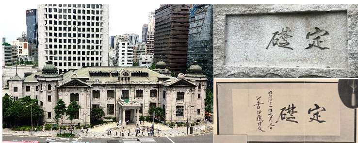 위 사진은 사적 제280호 ‘서울 한국은행 본관’ 현재의 정초석. 당시 정초 일자와 서명은 지워져 있고, 후에 “융희 3년 7월 11일”(1909.7.11.)이 새겨져 있다. 밑의 사진은 일본 하마마쓰시 시립중앙도서관의 하마마쓰시 문화유산 디지털아카이브 자료. ‘명치 42년(1909년) 7월 11일 공작 이등박문’이라는 글씨가 선명하게 새겨져 있다. |문화재청 제공