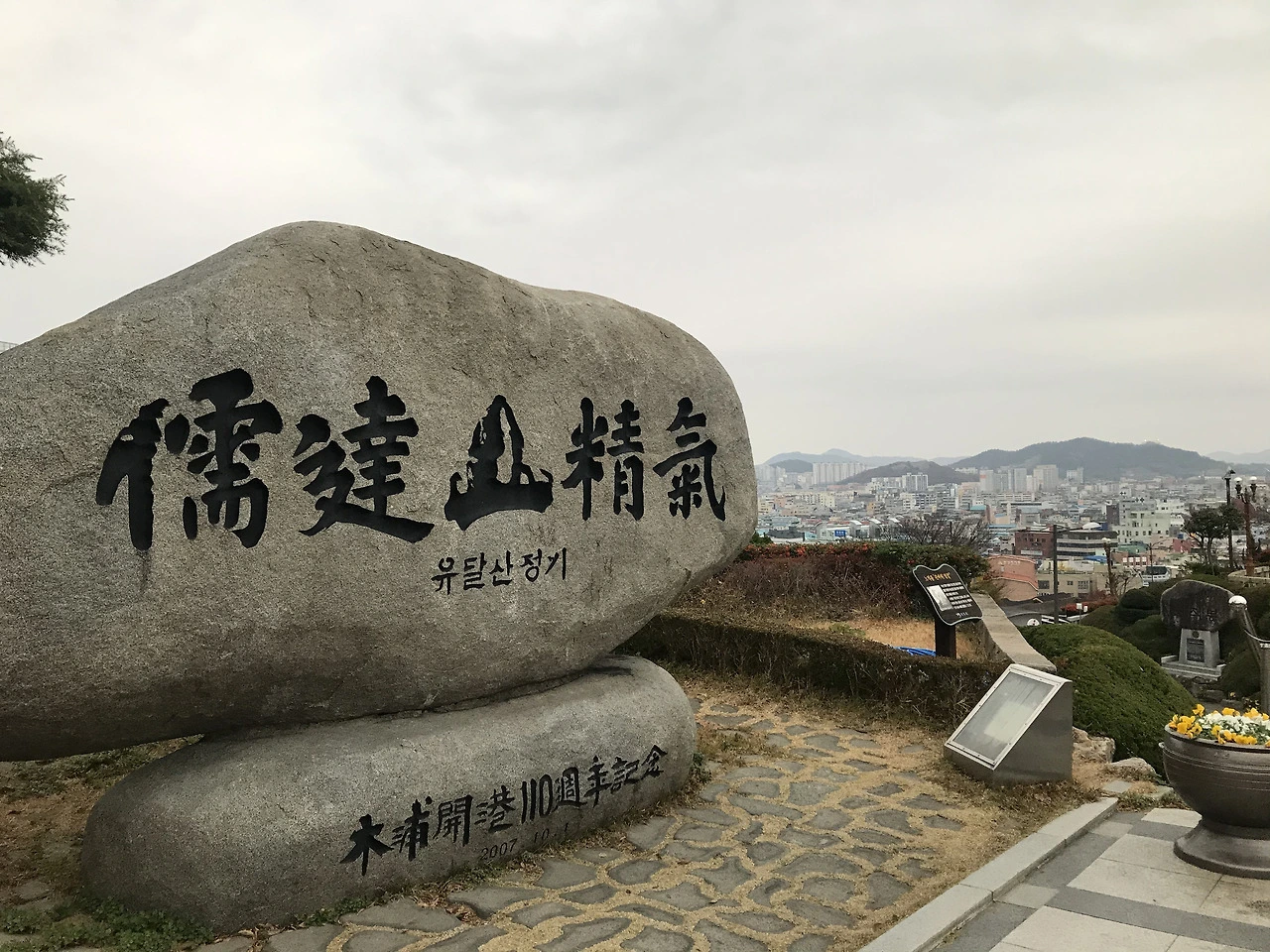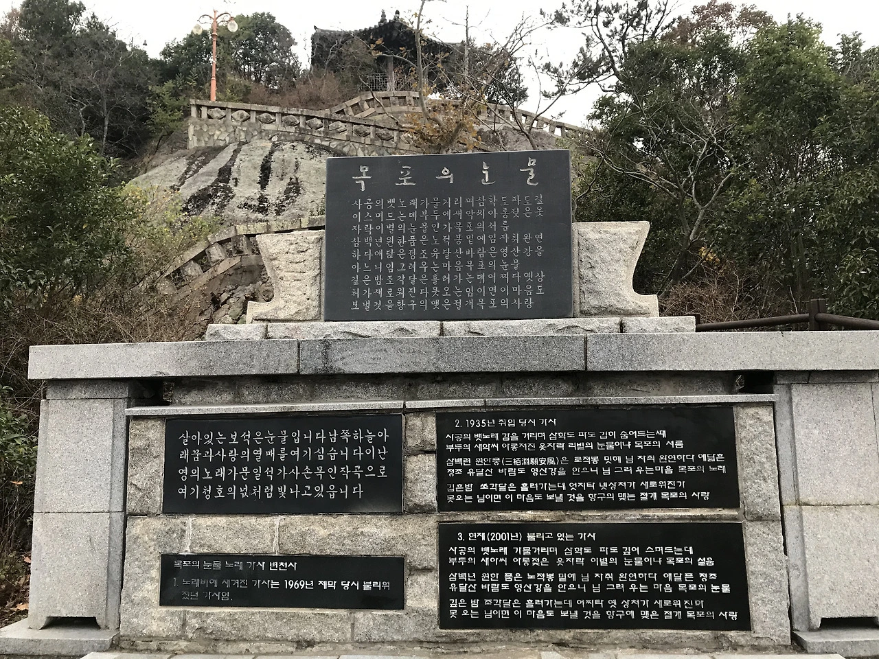 유달산은 일반적인 등산이나 트레킹에서 기대할 수 있는 것들 대신 특별한 것들을 내어놓고 있었는데, 특히 전시되어 있던 대포와 끊임없이 흘러나오는 노래 가락은 특별하다 못해 이상한 느낌마저 들게 했다. 지금의 한국인들에게는 그리 익숙하지 않은 옛 노래지만 오래전에는 꽤 유명했던 가수 이난영이 부른 목포의 눈물이다. 목포라서 이 노래를 틀어 놓은 건가? 산 중턱에 이 노랫말을 적어놓은 비석이 세워져 있고, 산속에서 수 십 년 전 가수의 애끓는 목소리가 끊임없이 흘러나온다는 것은 쉽게 예상되지 않는 일이다. 어렴풋이 앞으로는 목포의 눈물을 잊지 못할 것 같다는 생각이 들었다.