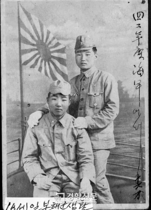일본군으로 강제 징집된 2명의 젊은이가 일본 나가사키 해군사령부의 함정에서 사진을 찍었다. 욱일승천기를 배경으로 한 한국 두 젊은이의 표정에서는 슬품이 묻어난다.│광주시 제공 / 경향신문 2025.8.11