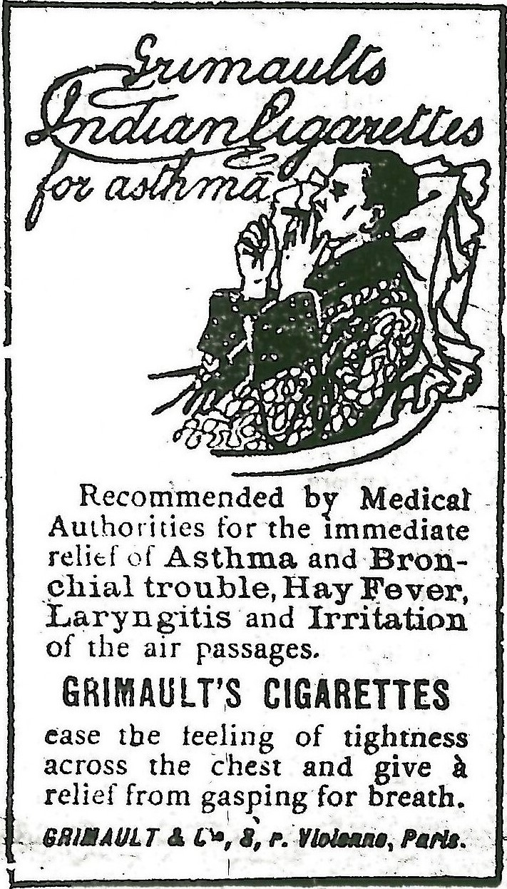 "프랑스의 Grimault & Co.라는 제약회사가 만든 Grimault Cigarette라는 담배가 있었는데, 일반 담뱃잎과 함께, 대마초와 벨라돈나(belladonna)와 같은 향 정신성 또는 독성이 있는 약초를 혼합한 제품으로 천식, 기관지 염증, 기침, 호흡기 질환 완화용이라고 광고를 해서 1930년대 까지 전 세계에서 팔렸지."
