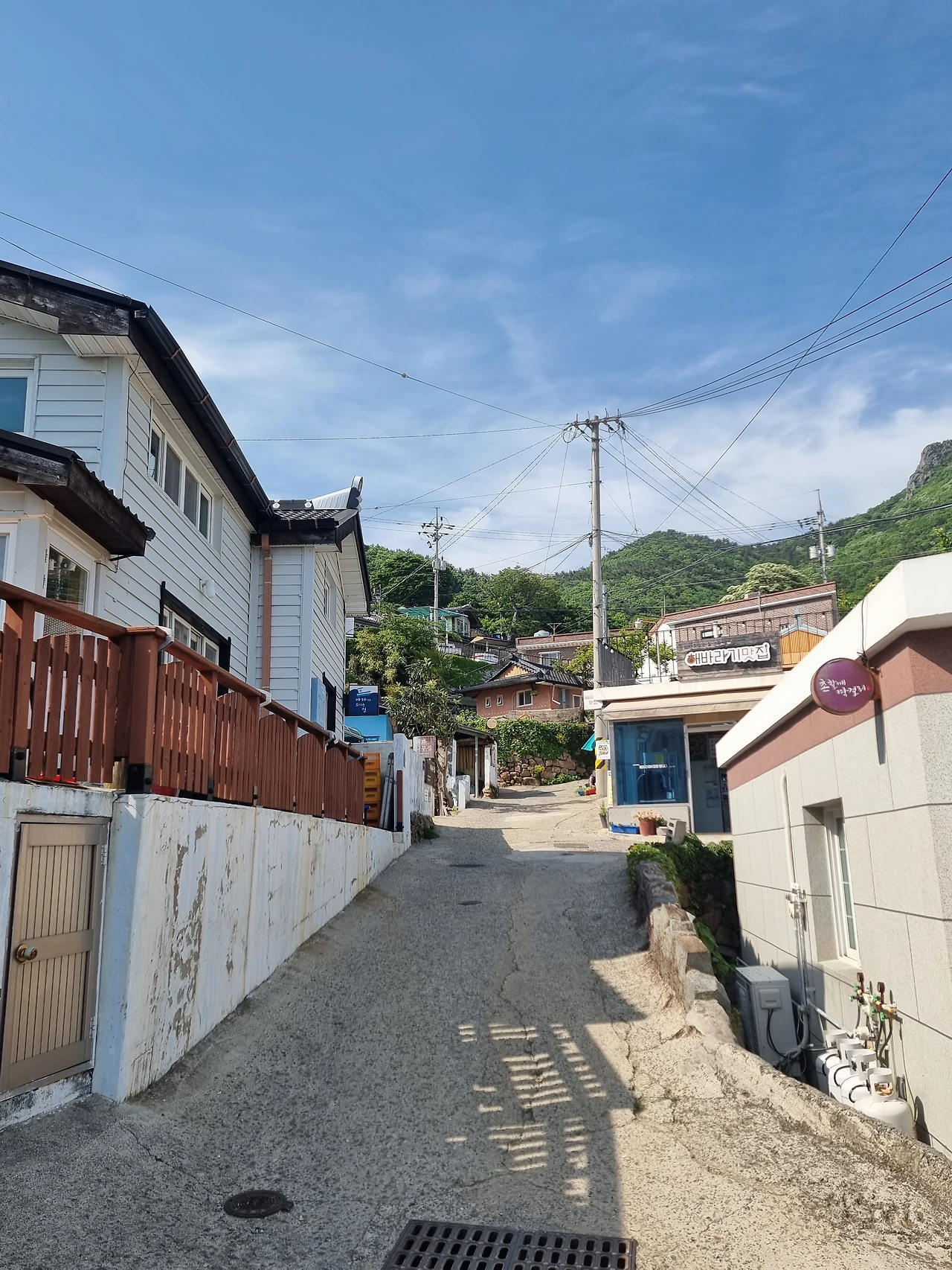 한쪽은 바닷길이고 한쪽은 마을이 형성되어 있다.