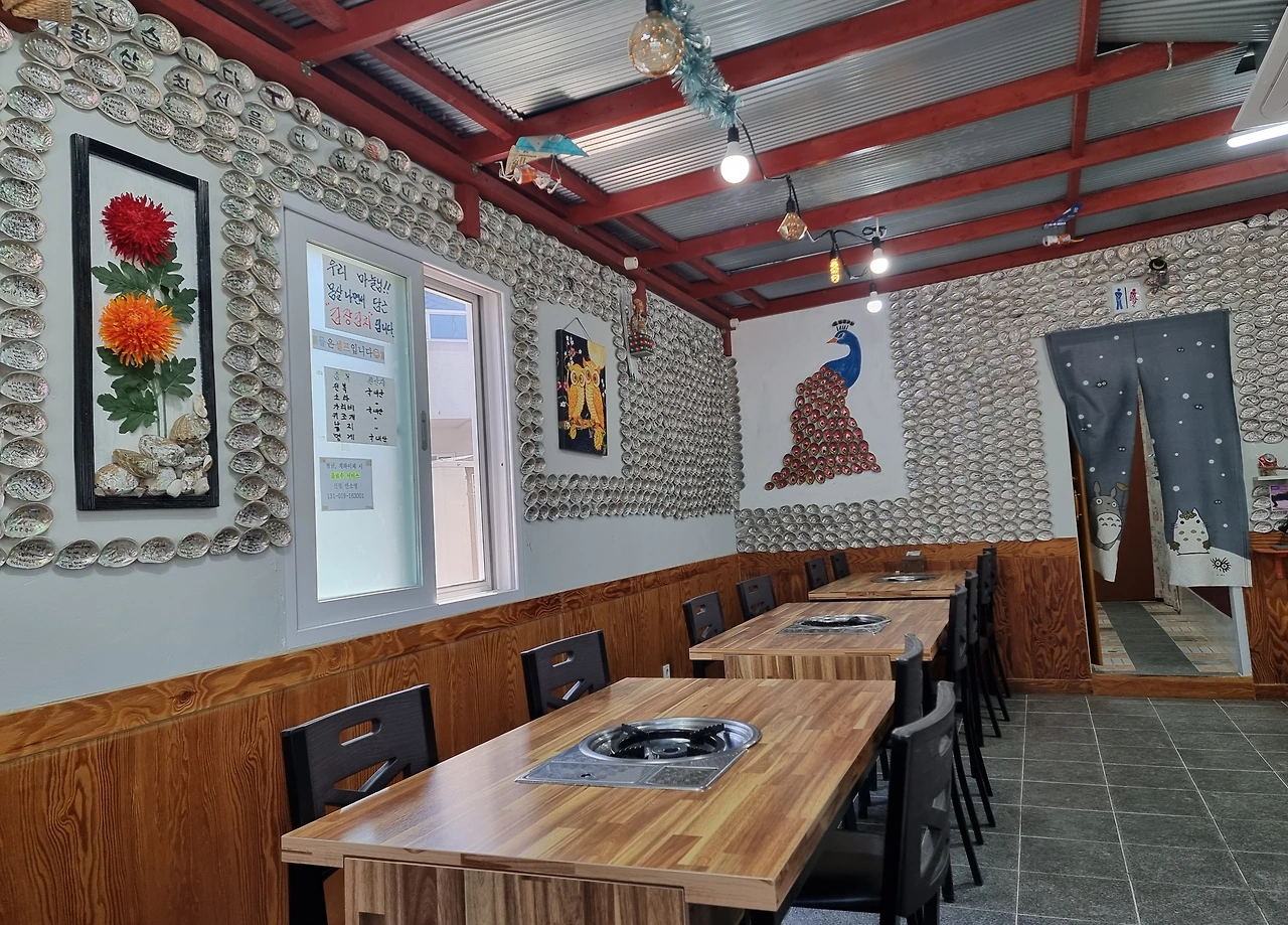 전복(?) 껍질로 식당벽면을 모두 메꾸었고 껍질 안에다 손님들의 메모를 남겨놓았다.
