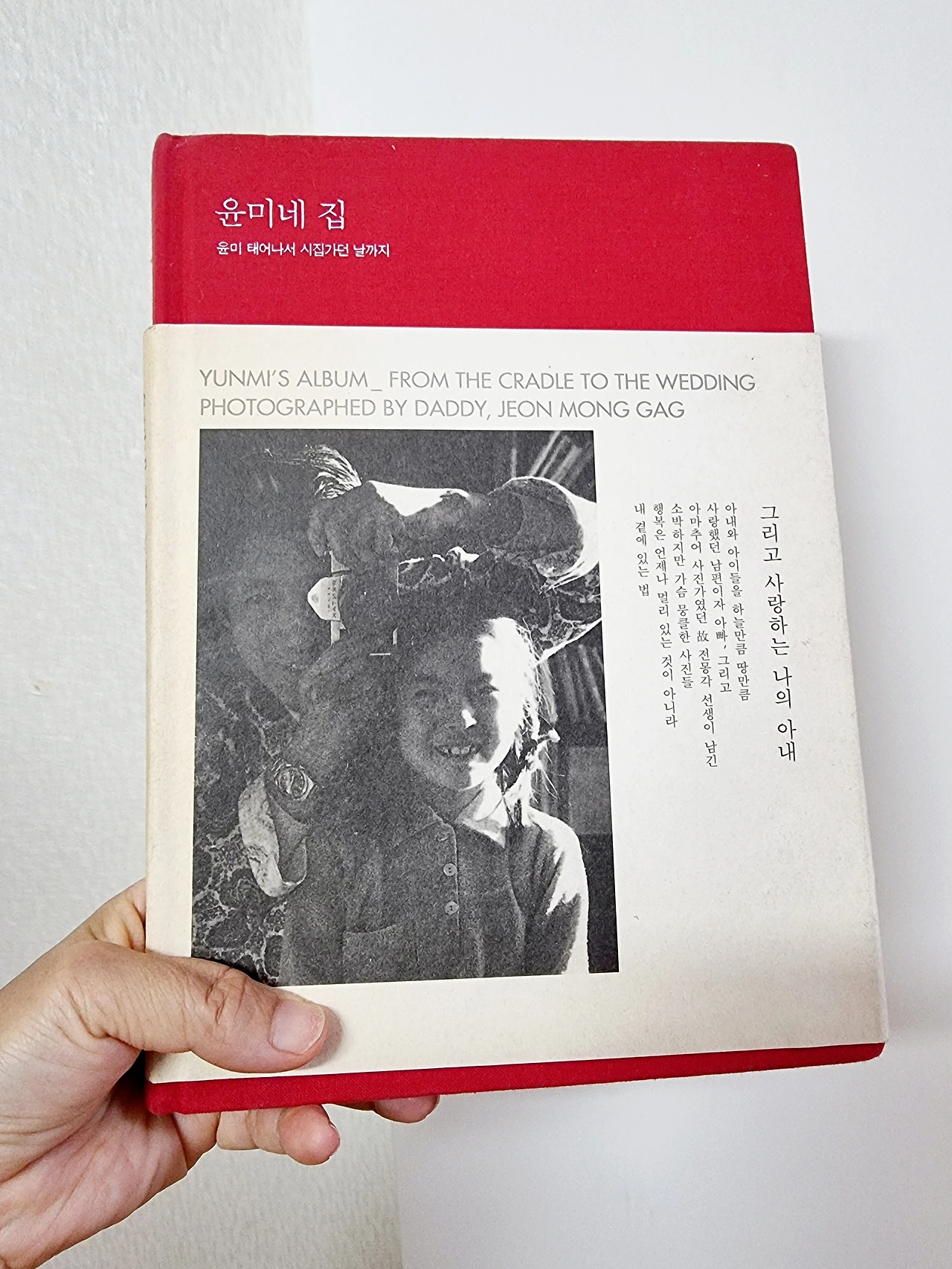 손에는 사진집을 여러 권 안고 있었다. 사진을 배우기 전에 사진집을 한번 보라는 강사의 배려였다. 그중에서 내가 고른 것은 “윤미네 집”이라는 사진집이었는데 갓난아기 윤미가 빙그레 웃으면서 누워있는 사진부터 시작이었다. 계속해서 윤미가 보행기를 타다가, 놀이터에 가서 그네를 타고, 초등학생이 되고, 또 중고등학교 교복을 입고 친구들과 걷다가, 대학 졸업식에 꽃을 들고 졸업을 하더니 이어서 웨딩드레스를 입은 장면이 마지막 사진이다. 그러니까 작가는 자기의 딸이 성장하는 모습을 흑백사진으로 차곡차곡 담아놓은 것이다. 한 장 한 장 넘어갈수록 아빠의 따듯한 사랑이 고스란히 느껴지면서 가슴이 뭉클해 왔다. 감동이다!