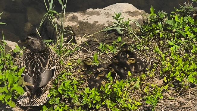 살며시 폰을 꺼내 카메라를 들이대고 유심히 지켜보니 어미가 조금씩 움직이면 주르륵 일곱 마리 새끼들이 꼬물 꼬물하며 따라 움직인다.