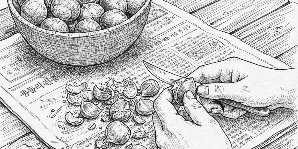 다음 날 아침 쪼그리고 앉아 생밤을 까는데 자꾸 춤추던 내 모습이 떠올랐다. 기억을 지우는 마법의 지우개라도 있다면 쓱쓱 지워버리고 싶었다. “작가님 춤추는 거 잘 봤어요.” 혹시 지난 밤 나를 기억해 누가 이렇게 놀리지나 않을까. 너무 창피해서 별의별 생각이 다 올라왔다. 한번 그 생각을 하기 시작하니 점점 더 얼굴이 달아오르고 급기야 이 나이 되도록 악기 하나, 춤 하나 제대로 배우지 못하고 뭐했나 하는 자책에까지 이르렀다. 그런데 아차 하는 순간 손에 쥔 밤을 놓쳐 손을 쓱 베고 말았다. 검지 끝에서 피가 스며났다. ‘이 놈의 정신머리! 밤을 까면서 밤 생각은 않고 오직 춤 생각만 하고 앉아 있었구나.’ 서둘러 서랍을 뒤져 밴드를 찾아 붙이는데 순식간에 멈칫했다.