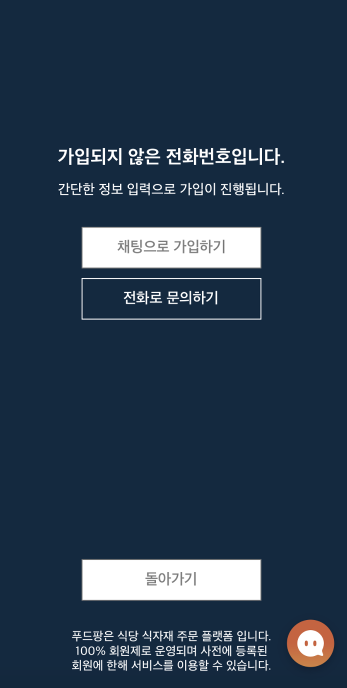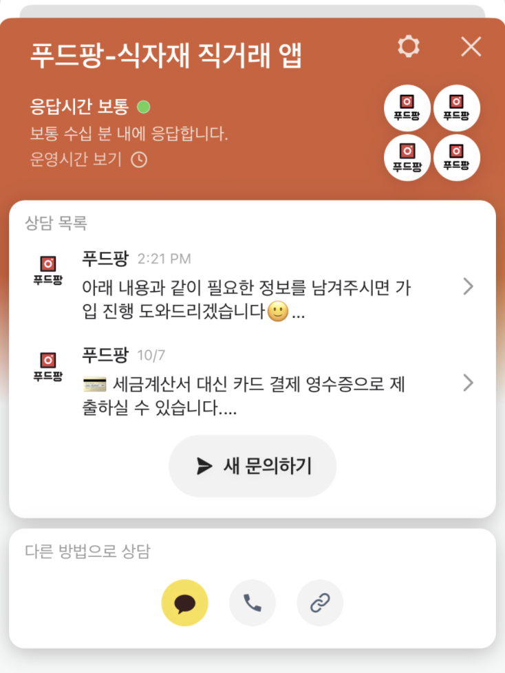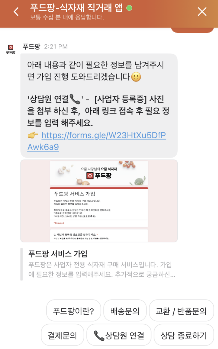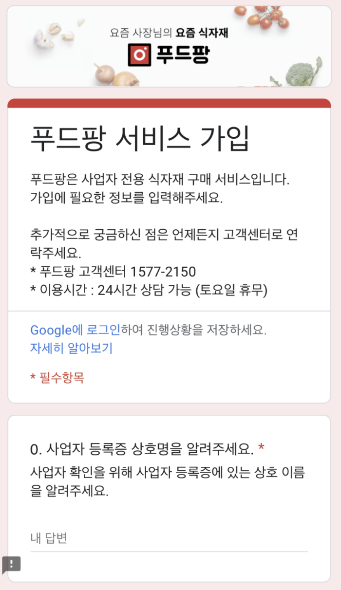 앱 내에 카톡 간편 로그인 도입(사업자 등록증 상호명, 운영하는 정확한 가게명 주소, 식당 영업시간, 어떤 경로로 푸드팡 접속했는지, 이용약관)