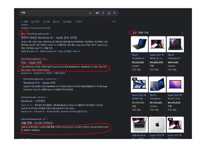 구글에서 맥북을 검색하면 광고부터 나온다.