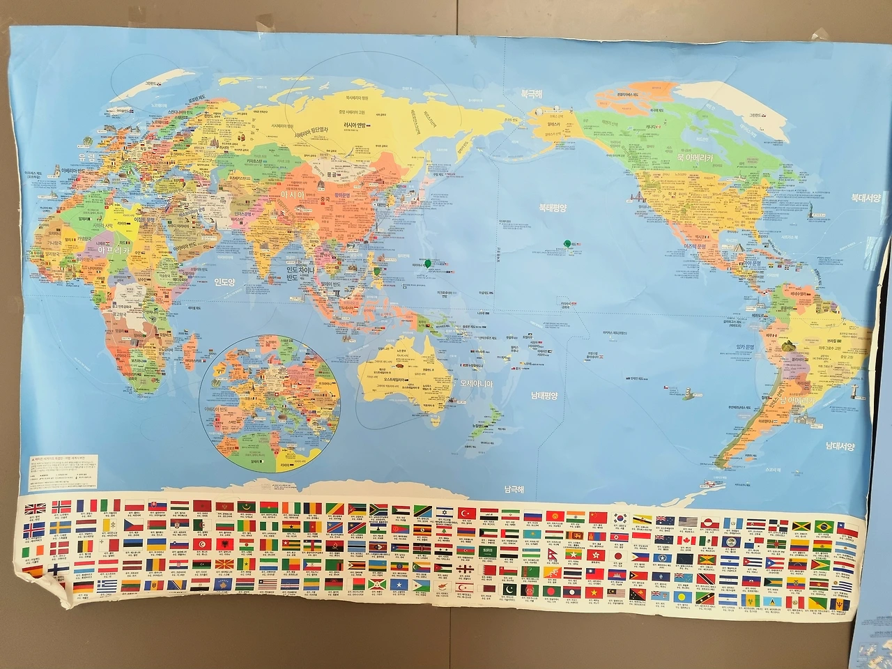 지구 위에 경계를 나누며 자리 잡은 국가들을 카드로만 보는 것이 답답해 보여 세계 지도를 사주기로 했다. 처음에는 각 지역에 사는 동물 그림이 그려진 아기자기한 지도로 시작. 아이가 닳도록 지도만 연구하다 보니 어느새 벽에 붙여놓은 세계지도만 3종 정도가 (사실 더 있었던 것도 같은데 가물가물) 스쳐갔다. 그중 지금 부엌 아일랜드에 붙어있는 지도는 국기가 함께 그려진 지도다. 국가 표기가 꽤 자세한 편이지만 공간 제약상 표시되지 않은 국가명들도 있어 다른 지도와 지도책들을 번갈아 찾아보기도 한다.