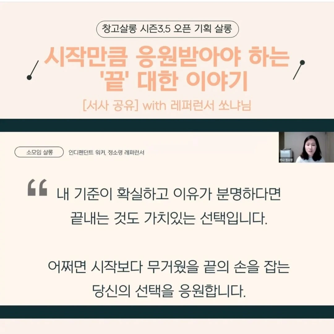 실제로 살롱 발표자료를 만들면서는 여러 번 머리를 쥐어뜯었다. 이런 찌질하기 그지없는 고민 과정을 공유하는 게 무슨 의미가 있을까. 시간을 내서 들으러 와주는 분들에게 의미 있는 시간이 되어야 할 텐데, 이걸로 충분할까. 리허설 후 피드백에 어느 때보다 더 귀 기울였던 것 같다. 그걸 바탕으로 충실히 수정했다. '시작'을 얘기할 때와는 다른 에너지가 드는 일이었다. '끝'에 의미를 부여한다는 건.