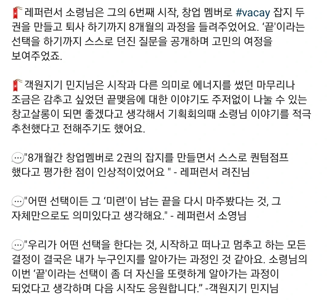 퇴사 후 몇 개월이 지나고 보니 더더욱 가벼워졌다. 8개월의 시간은 바람결에 날아가버린 느낌이다. 내가 매거진 창간이란 걸 한 적이 있던가, 내가 두 권의 매거진을 만들기는 했던가, 취재하고 인터뷰하던 날이 언제였더라. 나조차 꿈결 같은 찰나의 시간. 그런 생각을 하다가 문득 창고 살롱에서 했던 서사 공유가 떠올랐다. "시작만큼 응원받아야 하는 '끝'에 대한 이야기" 나는 그때 나의 끝을 응원하고 싶었다.