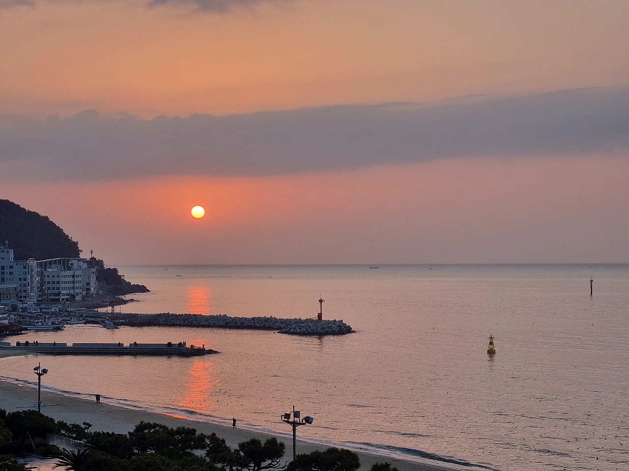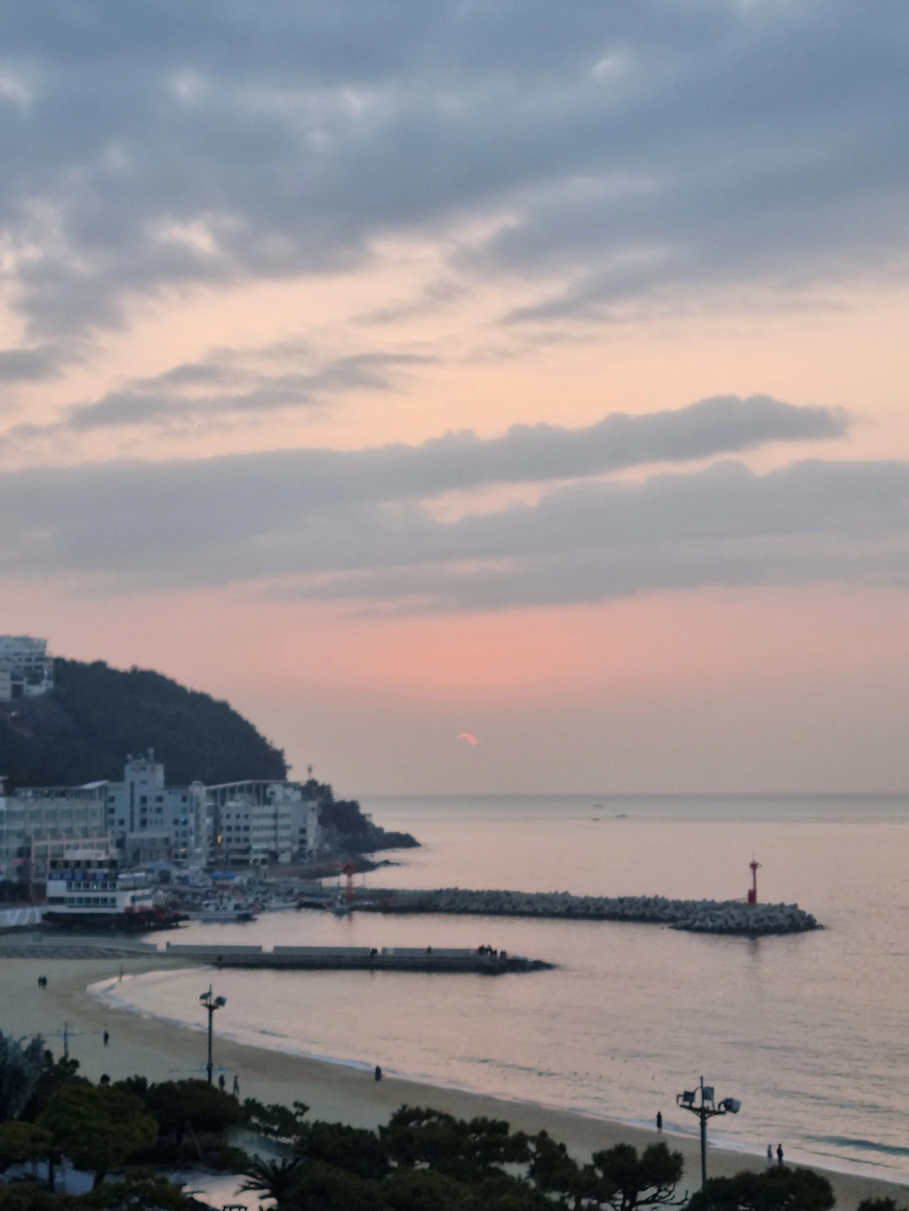 내 예상대로 잠옷 위에 외투만 걸치고 보는 일출은 아름다웠다. 정확히 정면에서 뜨는 해는 아니었지만, 조금만 왼쪽으로 고개를 돌리면 볼 수 있는 붉은 태양, 파스텔톤 하늘. 시작의 설렘을 느끼게 하는 순간.