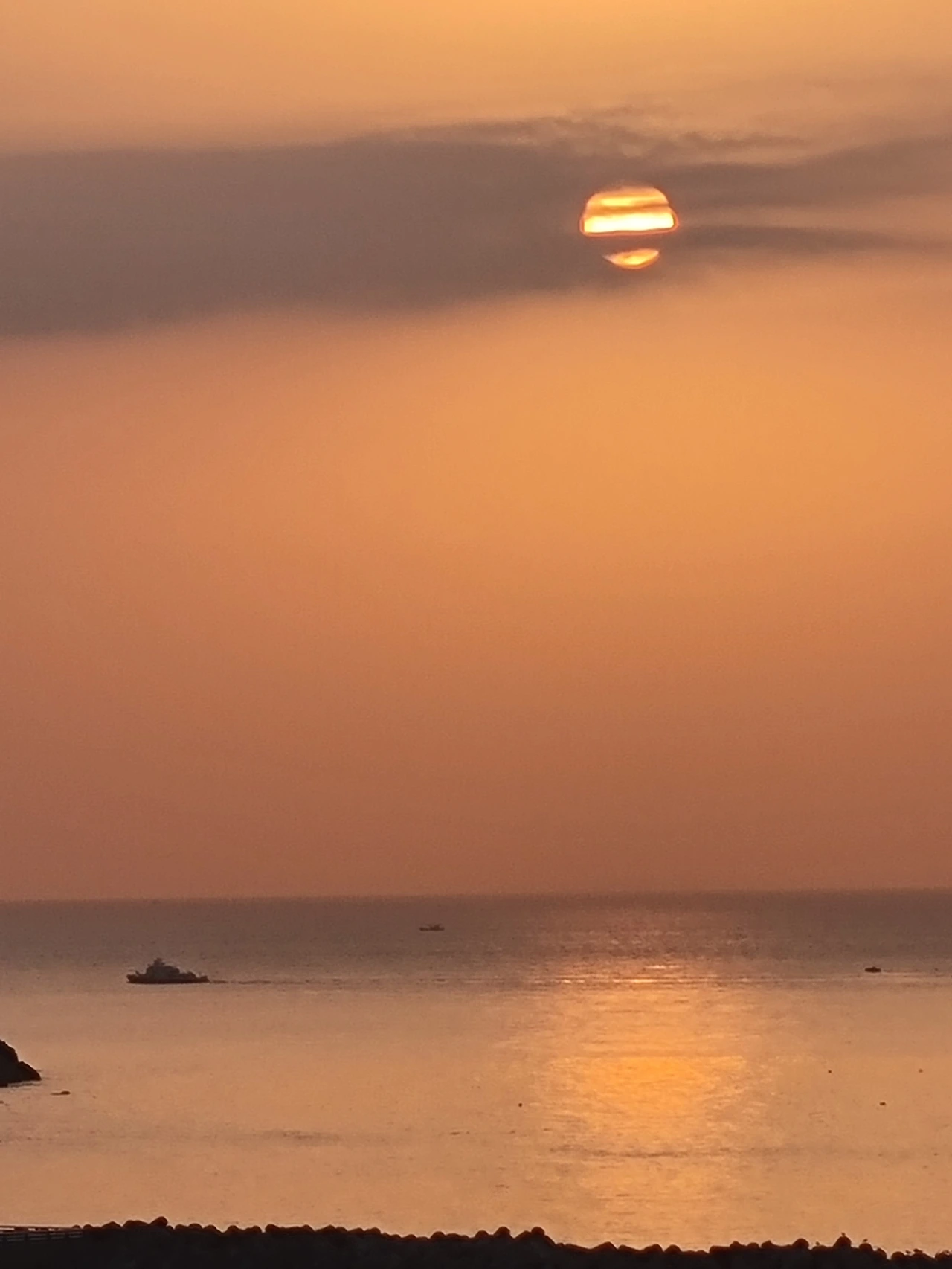 역시 예상했던 대로다. 하늘에 붉은빛이 퍼져나갈수록 지평선 위 구름도 빛을 발했고, 레이스 뒤 전등빛처럼 구름 뒤의 태양은 보였다 숨었다 했다. 구름과 태양이 만들어낸 스트라이프라니. 역시 구름 없는 하늘보다는 구름무늬를 더한 하늘이 더 사랑스럽다. 마침내 구름을 완전히 벗어난 태양을 보면서 생각한다. '역시, 딱 지금 하늘이 (태양이, 그리고 바다가) 좋아.'
