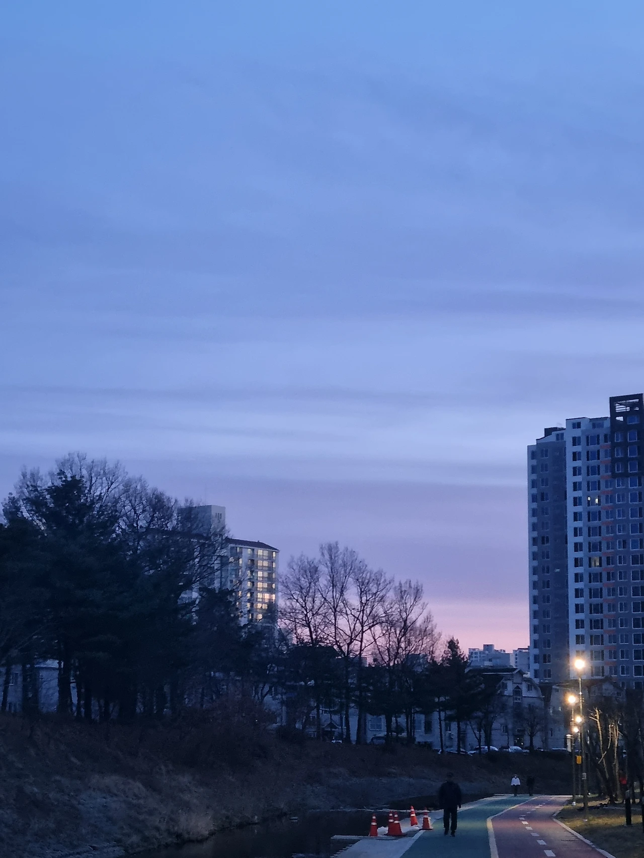 오늘도 6시의 알람이 울린다. 어제보다는 조금 더 무거운 몸을 뒤척여 본다. '그래도 하루 만에 그만둘 수는 없지.' 게다가 어제는 그녀가 원했던 그 짙은 하늘을 보지 못하지 않았던가. 오늘은 꼭 보겠다는 마음으로 새벽을 달리는 이들에게 시간도 물어둔 터였다. 어제보다 30분 당겨 6시에 나가기로 이미 계획해 두었다. 역시 일어나야겠다. 오늘도 새벽을 깨운 건 몸이 아니라 정신이다.