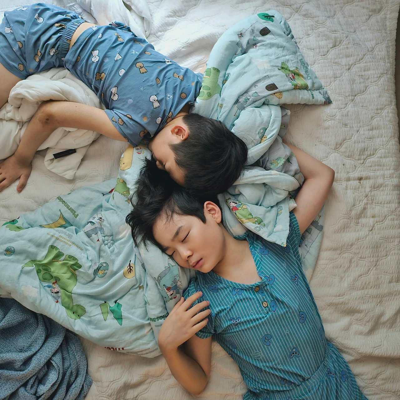 동생을 깨우러 간 엄마가 한참 나오지 않자 첫째가 찾으러 왔다. 상황을 보더니 동생 옆에 슬그머니 눕는다.